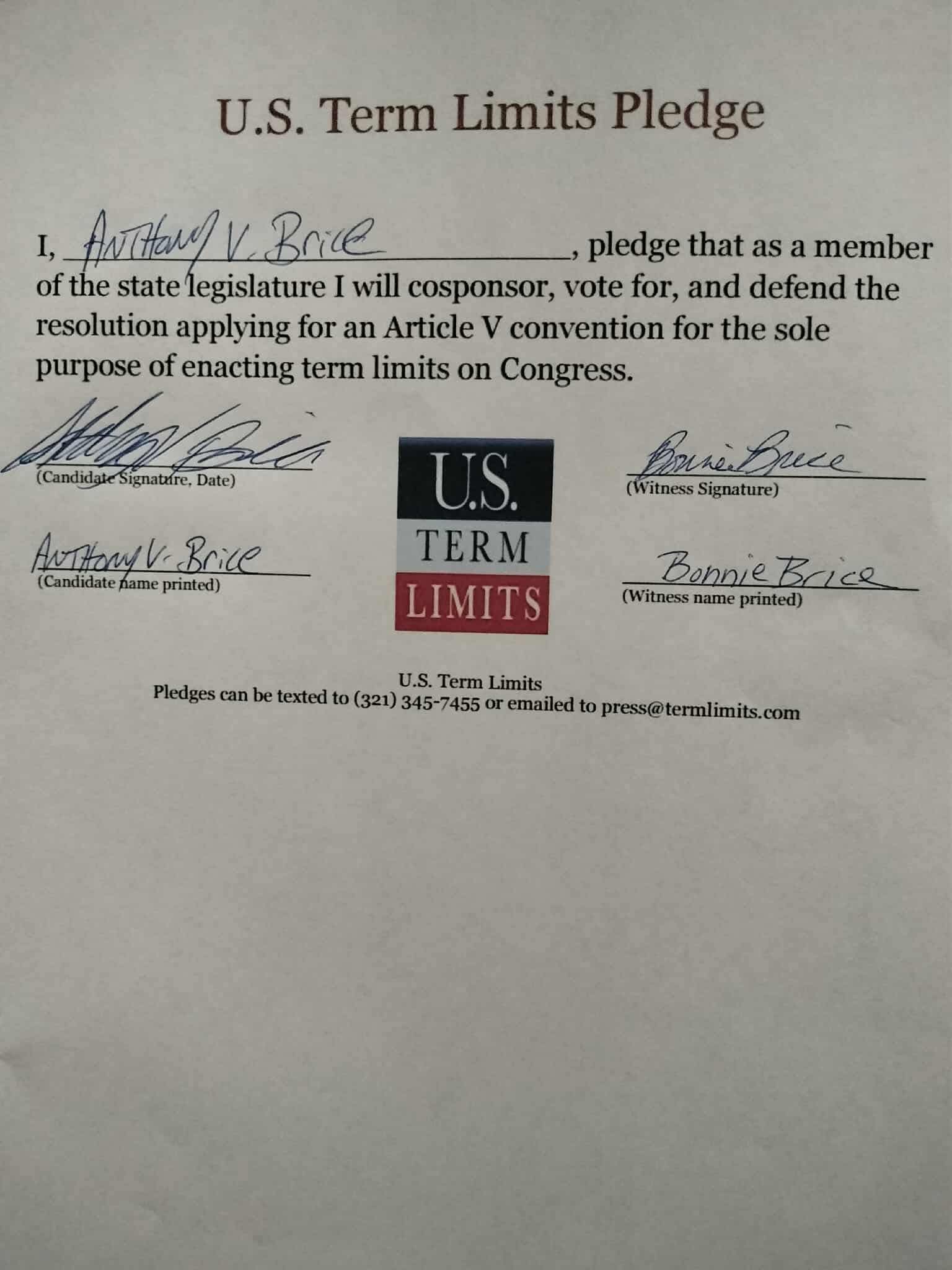 Anthony Brice Pledges to Support Congressional Term Limits