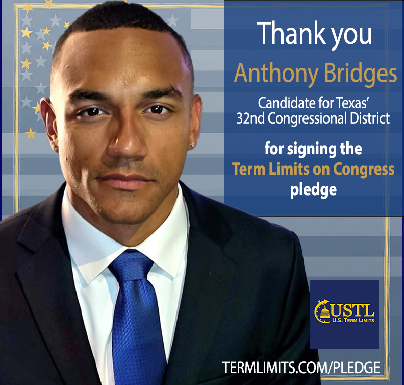 Washington D.C. – U.S. Term Limits (USTL), the leader in the non-partisan national movement to limit terms for elected officials, praises 2026 U.S. House of Representatives candidate for Texas, Anthony Bridges (district 32), for signing the pledge for an amendment to term limit Congress. Previously, candidates Darrell Day and Aimee Carrasco also signed the pledge.