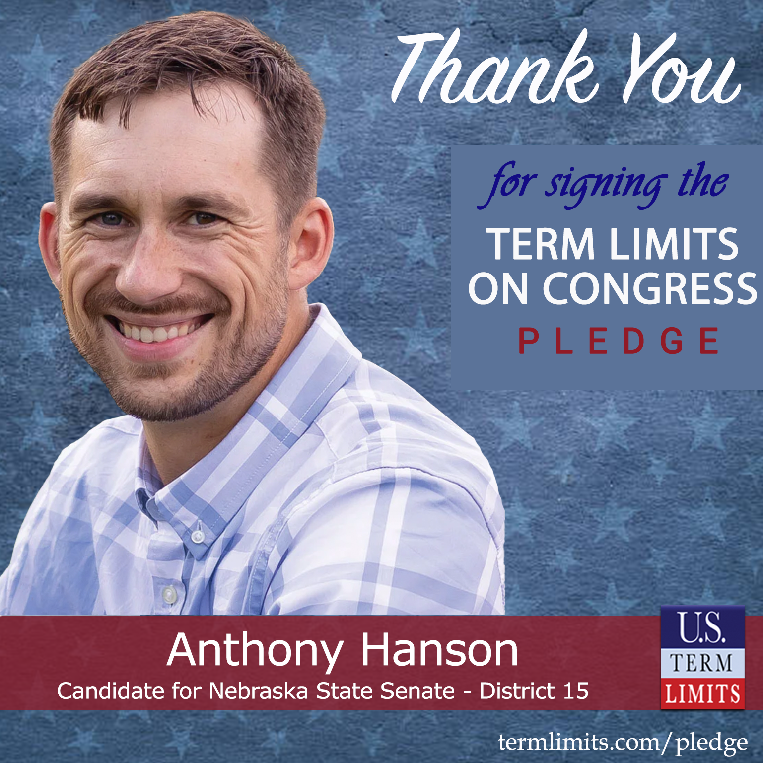 Fremont, NE – U.S. Term Limits (USTL), the leader in the national, non-partisan movement to limit terms for elected officials, is gathering support from state lawmakers across the nation. Its mission is to get 34 states to apply for an amendment proposal convention specific to term limits on Congress. Nebraska state senate candidate, Anthony Hanson (District 15), has committed support for term limits on Congress by signing the term limits convention pledge. Previously, candidate Scott Thomas also signed the pledge.