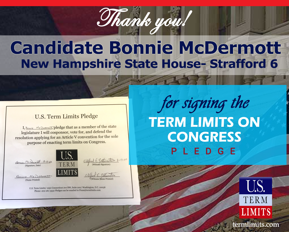 The U.S. Term Limits pledge is provided to candidates and members of state legislatures. It reads, “I pledge that, as a member of the state legislature, I will cosponsor, vote for, and defend the resolution applying for an Article V convention for the limited purpose of enacting term limits on Congress.”