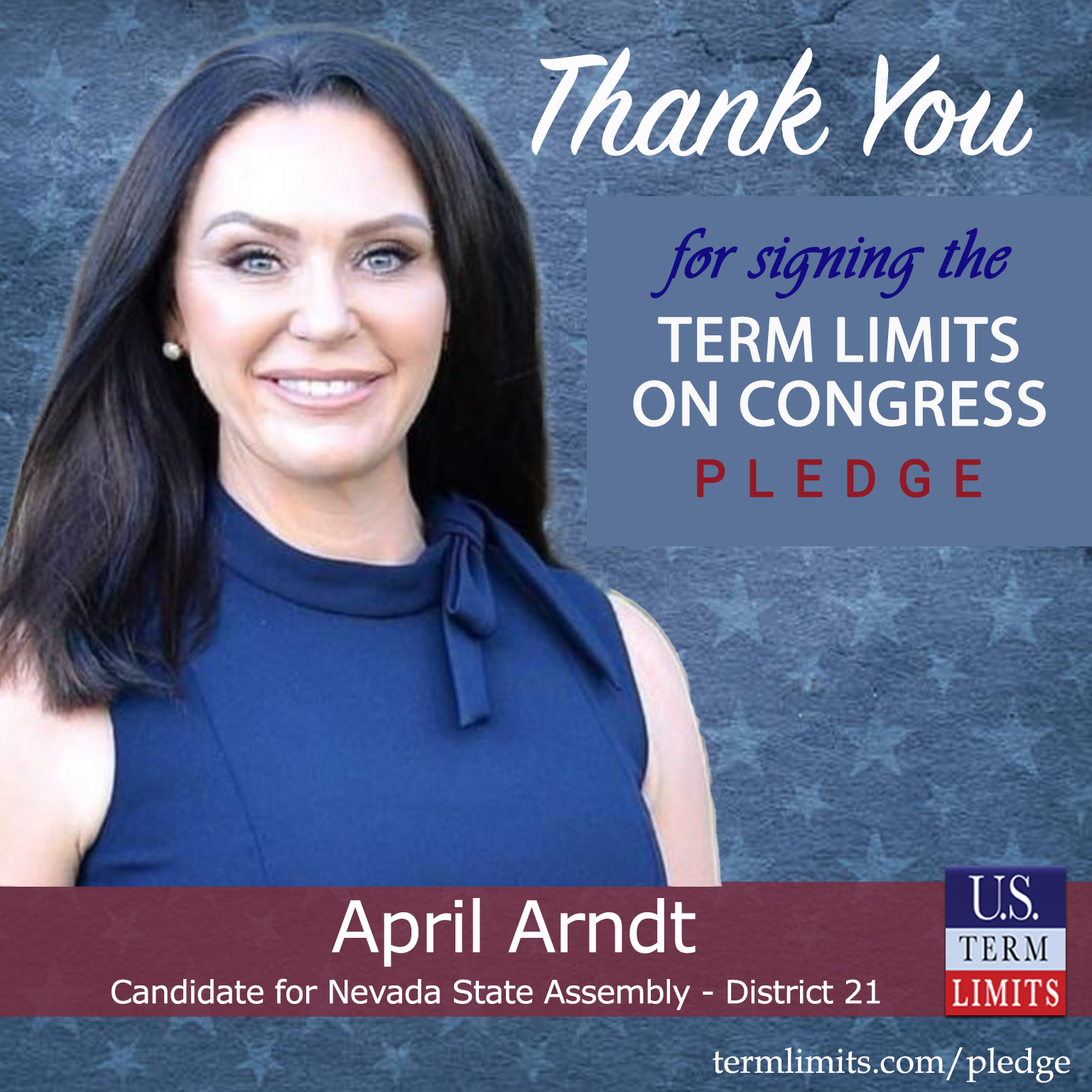 Henderson, NV – U.S. Term Limits (USTL), the leader in the national, non-partisan movement to limit terms for elected officials, is gathering support from state lawmakers across the nation. Its mission is to get 34 states to apply for an amendment proposal convention specific to term limits on Congress. Nevada state assembly candidate, April Arndt (District 21), has committed support for term limits on Congress by signing the Term Limits Convention Pledge.