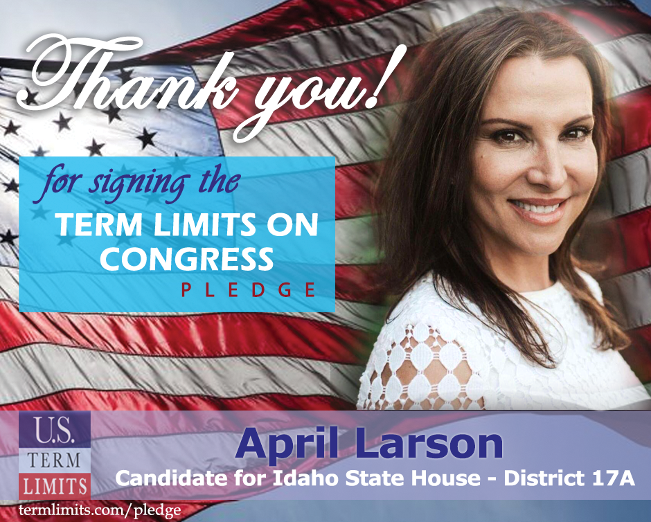 Boise, ID – U.S. Term Limits (USTL), the leader in the national, non-partisan movement to limit terms for elected officials, is gathering support from state lawmakers across the nation. Its mission is to get 34 states to apply for an amendment proposal convention specific to term limits on Congress. Idaho state house candidate, April Larson (district 17A), has committed support for term limits on Congress by signing the U.S. Term Limits pledge.  Larson is the first signer in this race.