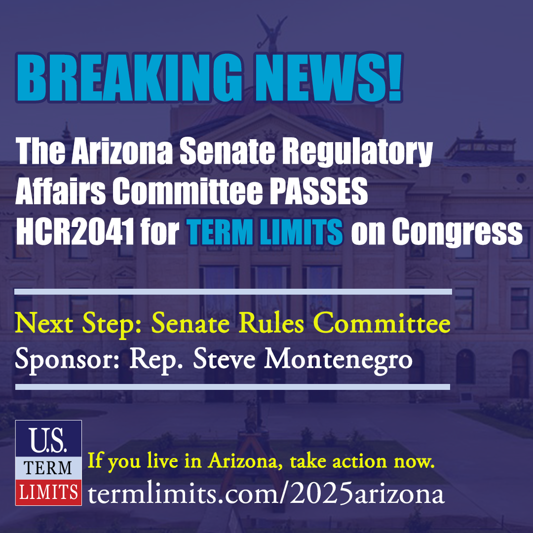 HCR2041 has bipartisan sponsorship and the support of more than 40 legislators who have signed the term limits pledge, promising to support the congressional term limits effort. The next step will be a vote in the Senate Rules Committee then the final vote will be in the senate chamber.