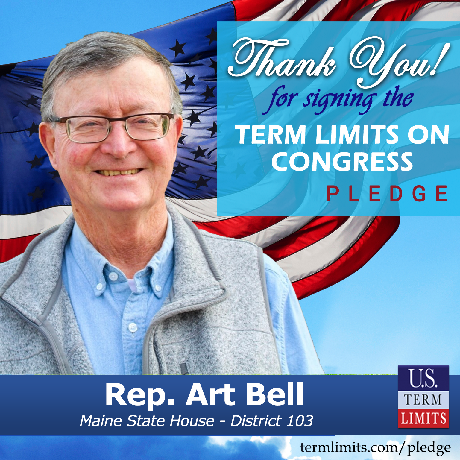 Yarmouth, ME – U.S. Term Limits (USTL), the leader in the national, non-partisan movement to limit terms for elected officials, is gathering support from state lawmakers across the nation. Its mission is to get 34 states to apply for an amendment proposal convention specific to term limits on Congress. Maine state Rep. Art Bell (District 103), has committed support for term limits on Congress by signing the Term Limits Convention Pledge.
