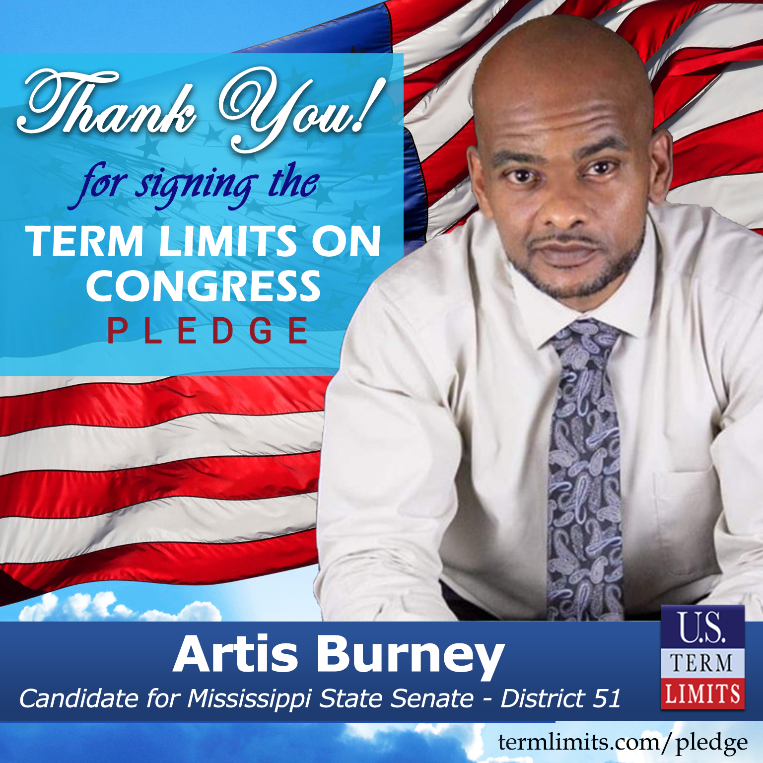Jackson, MS – U.S. Term Limits (USTL), the leader in the national, non-partisan movement to limit terms for elected officials, is gathering support from state lawmakers across the nation. Its mission is to get 34 states to apply for an amendment proposal convention specific to term limits on Congress. Mississippi state senate candidate, Artis Burney (District 51), has committed support for term limits on Congress by signing the term limits convention pledge. Burney is the first signer in this race.