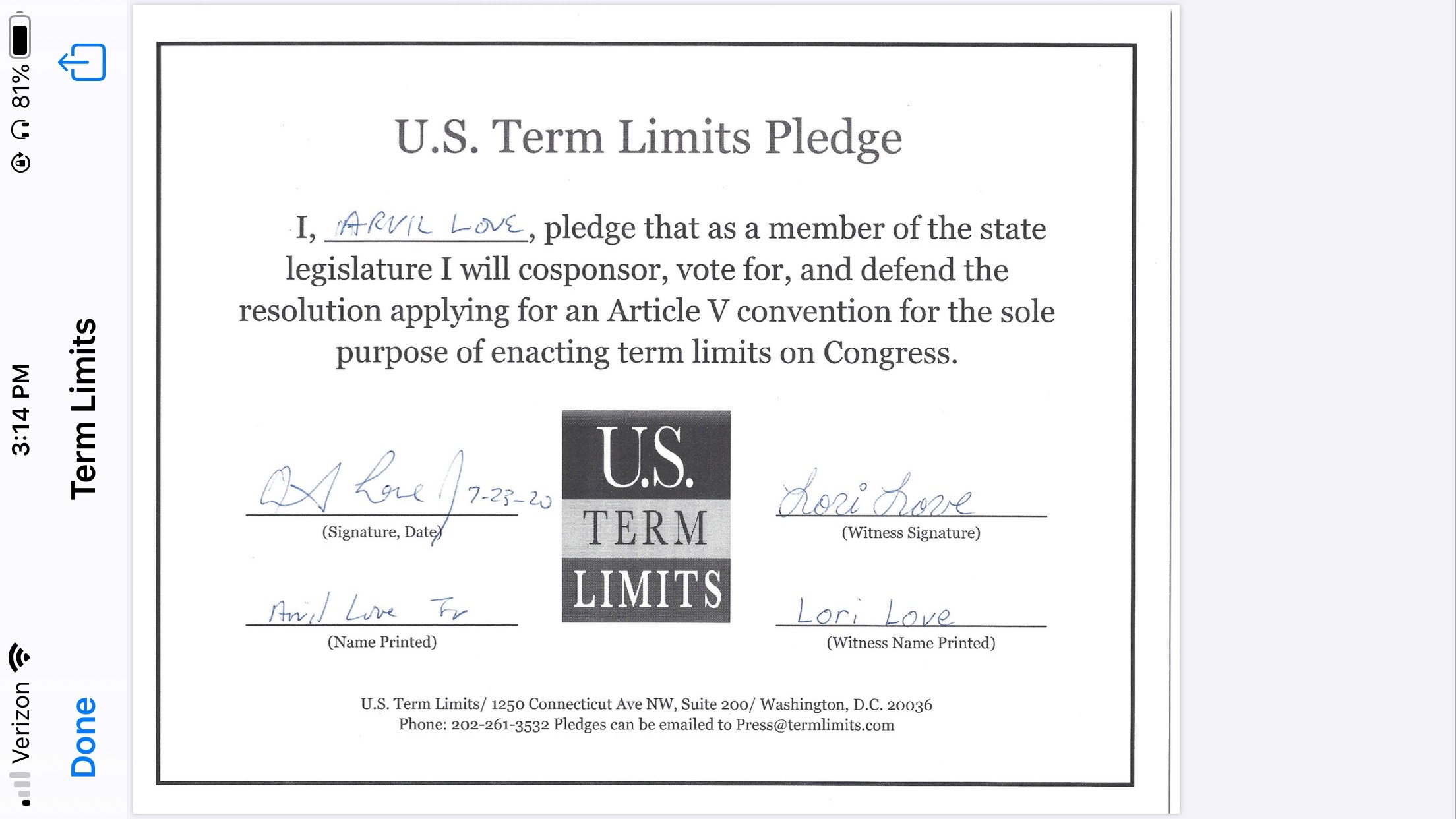 The U.S. Term Limits pledge is provided to candidates and members of state legislatures. It reads, “I pledge that, as a member of the state legislature, I will cosponsor, vote for, and defend the resolution applying for an Article V convention for the limited purpose of enacting term limits on Congress.”