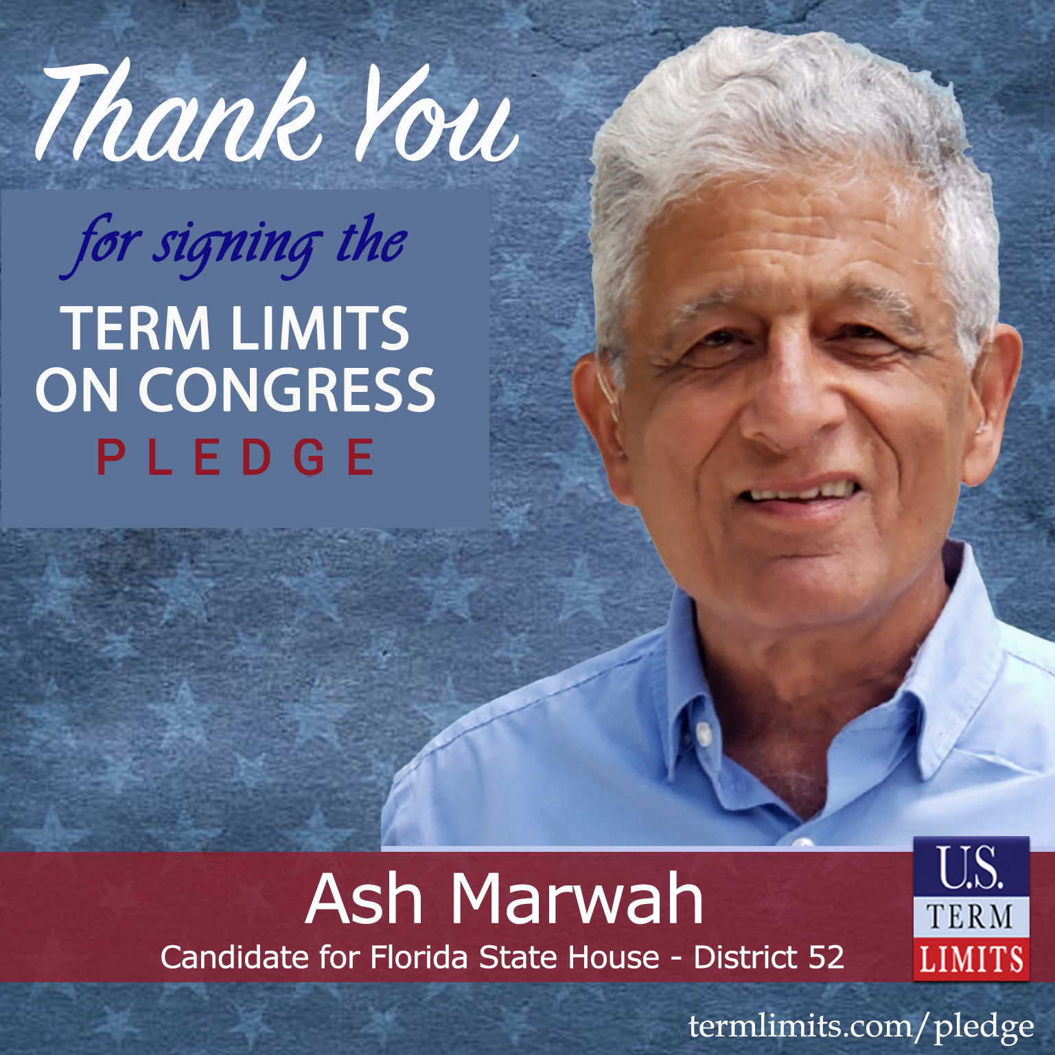 Leesburg, FL – U.S. Term Limits (USTL), the leader in the national, non-partisan movement to limit terms for elected officials, is gathering support from state lawmakers across the nation. Its mission is to get 34 states to apply for an amendment proposal convention specific to term limits on Congress. Florida state house candidate, Ash Marwah (district 52), has committed support for term limits on Congress by signing the term limits convention pledge.