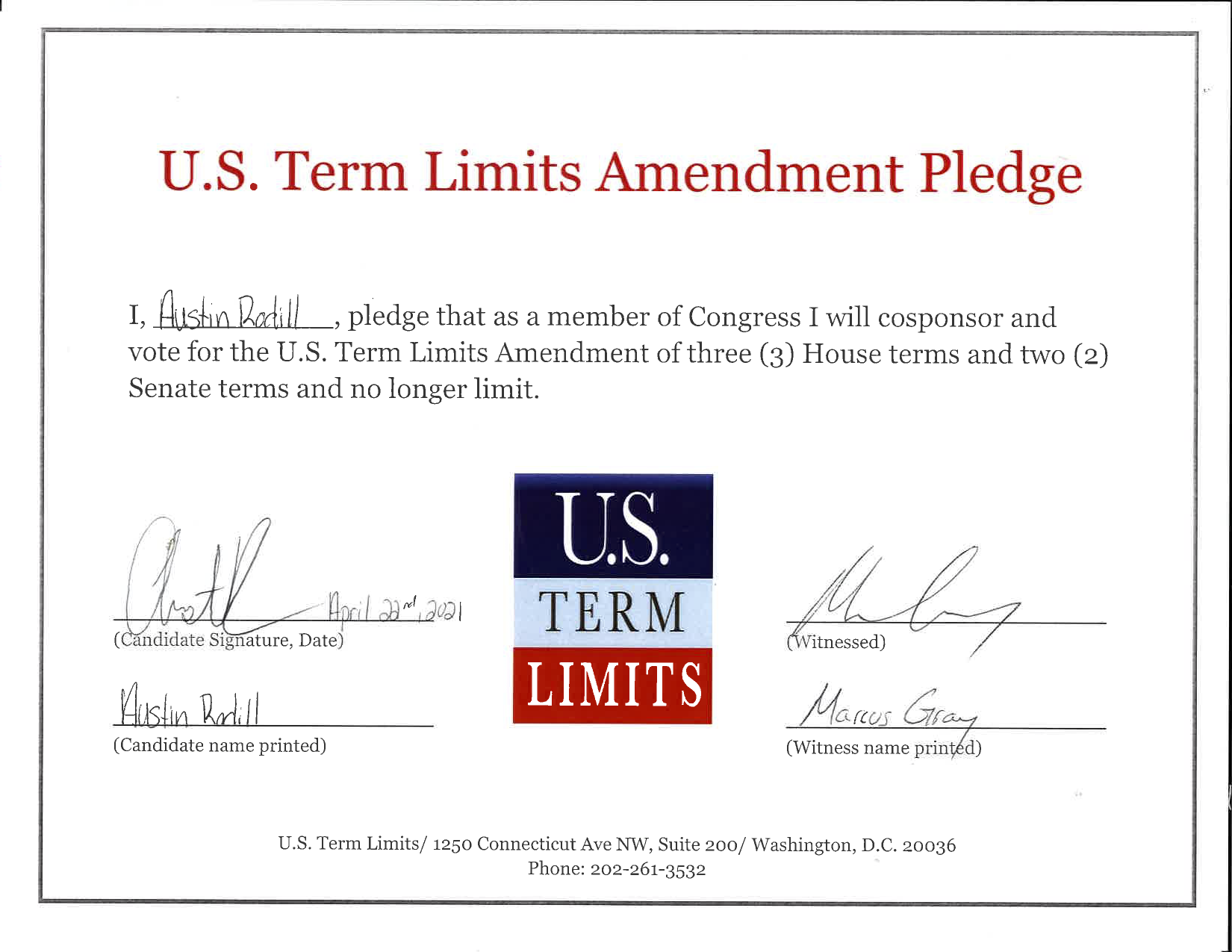 U.S. Term Limits has the support of more than 90 pledge signers in Congress. USTL President Philip Blumel commented on Rodill’s pledge saying, “Austin’s strong support of term limits shows that there are individuals who are willing to put self-interest aside to follow the will of the people. America needs a Congress that will be served by citizen legislators, not career politicians.”