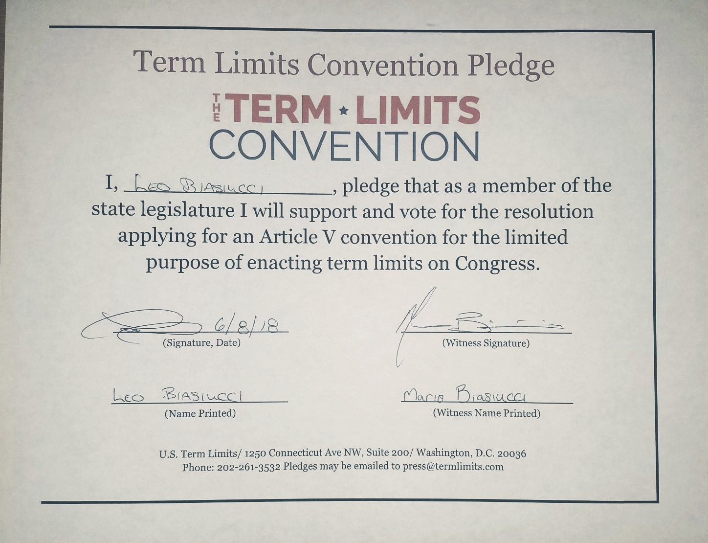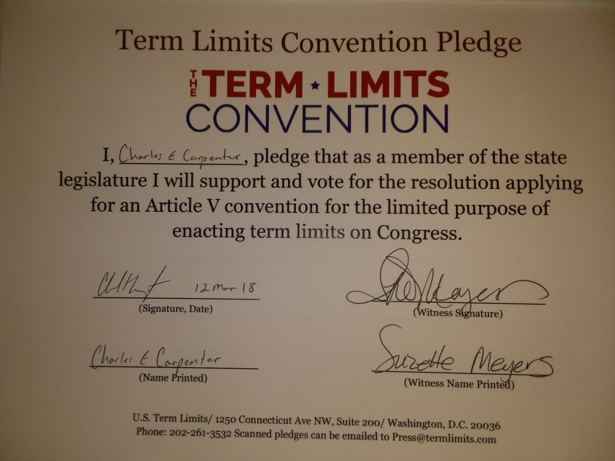 The U.S. Term Limits Amendment Pledge is provided to candidates and members of the state legislatures. It reads, “I pledge, that as a member of the state legislature, I will support and vote for the resolution applying for an Article V convention for the limited purpose of enacting term limits on Congress.”