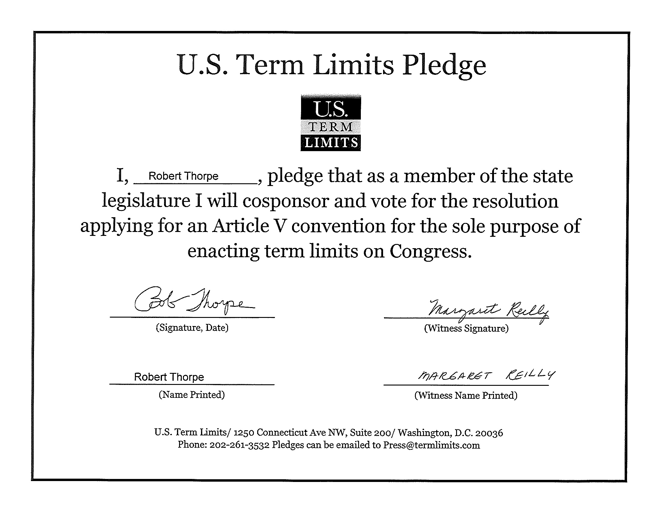 Washington, D.C. – U.S. Term Limits (USTL), the leader in the non-partisan, national movement to limit terms for elected officials, commends Arizona state house representatives David Cook and Bob Thorpe for signing its Article V pledge. They pledged to support a resolution applying for a congressional term limits convention.