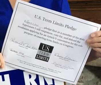 The U.S. Term Limits pledge is provided to candidates and members of state legislatures. It reads, “I pledge that, as a member of the state legislature, I will cosponsor, vote for, and defend the resolution applying for an Article V convention for the limited purpose of enacting term limits on Congress.”