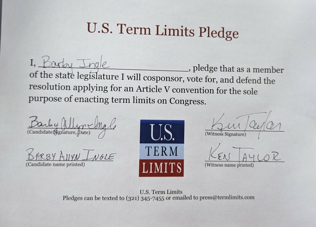 Flagstaff, AZ – U.S. Term Limits (USTL), the leader in the national, non-partisan movement to limit terms for elected officials, is gathering support from state lawmakers across the nation. Its mission is to get 34 states to apply for an amendment proposal convention specific to term limits on Congress. Arizona state house candidate, Barby Ingle (District 7), has committed support for term limits on Congress by signing the term limits convention pledge. Previously, candidate Andrew Costanzo and incumbent Rep. Dave Marshall also signed the pledge.