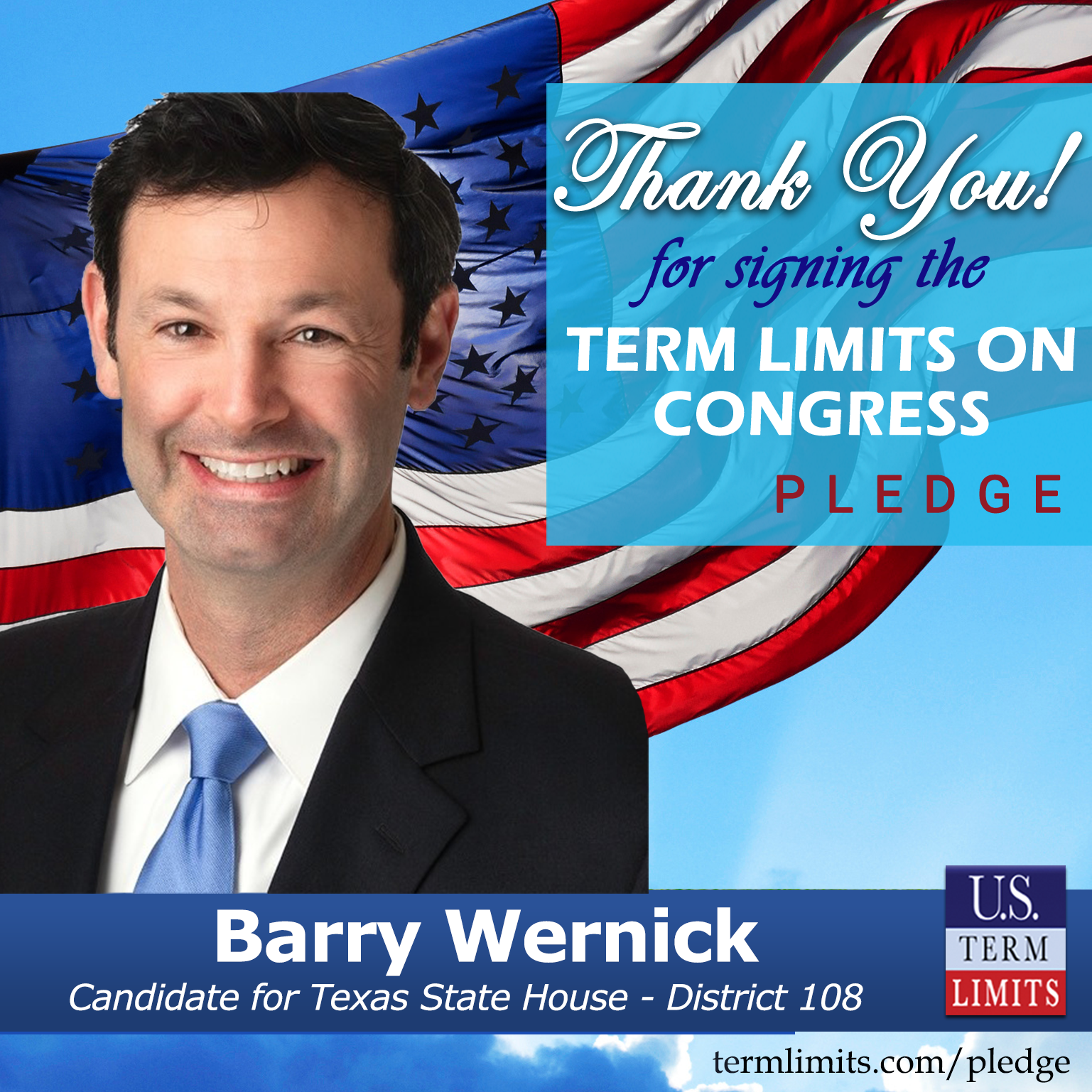 Austin, TX – U.S. Term Limits (USTL), the leader in the national, non-partisan movement to limit terms for elected officials, is gathering support from state lawmakers across the nation. Its mission is to get 34 states to apply for an amendment proposal convention specific to term limits on Congress. Texas state house candidate, Barry Wenick (District 108), has committed support for term limits on Congress by signing the Term Limits Convention Pledge. Wernick is the first signer in this race.