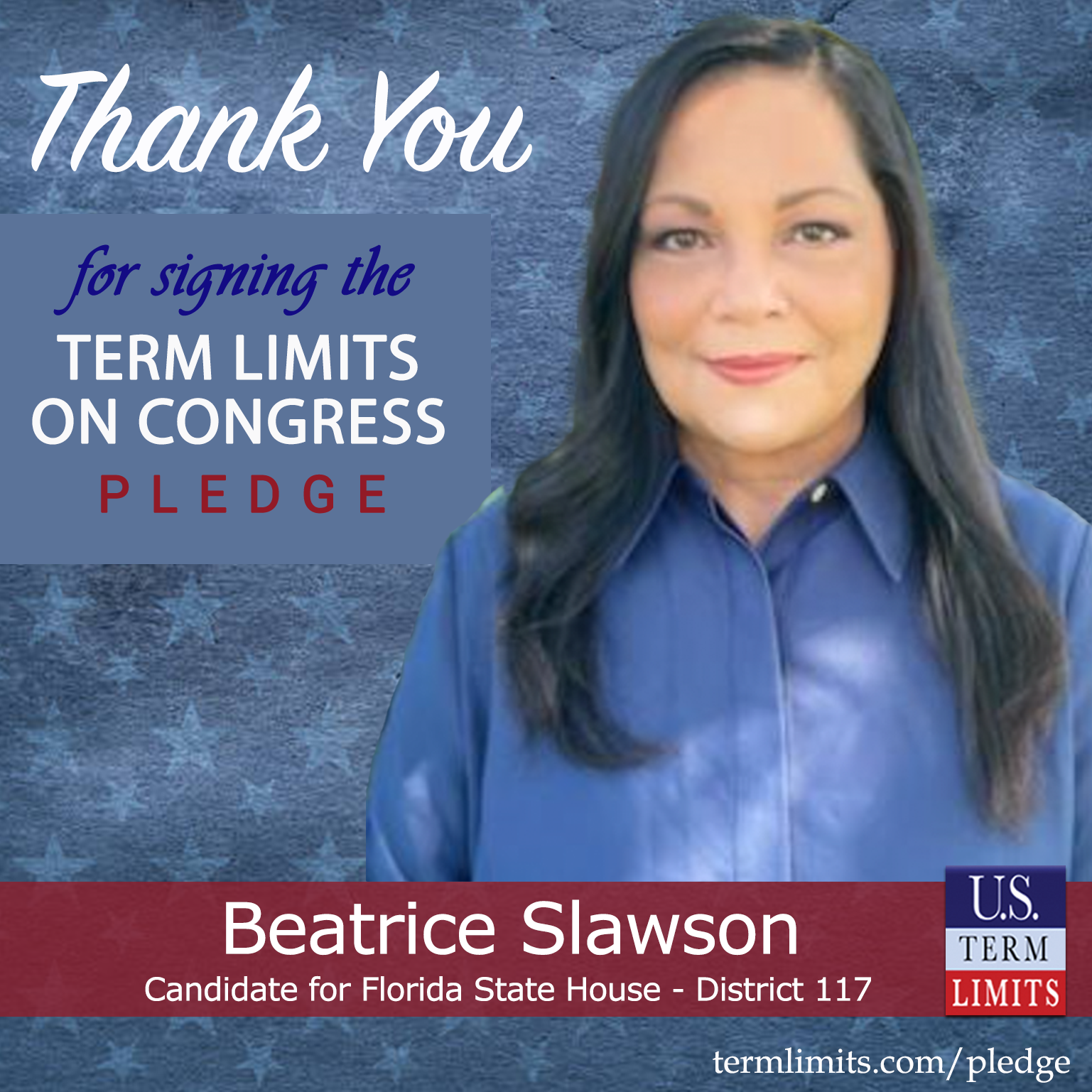 Homestead, FL – U.S. Term Limits (USTL), the leader in the national, non-partisan movement to limit terms for elected officials, is gathering support from state lawmakers across the nation. Its mission is to get 34 states to apply for an amendment proposal convention specific to term limits on Congress. Florida state house candidate, Beatrice Slawson (district 117), has committed support for term limits on Congress by signing the term limits convention pledge.