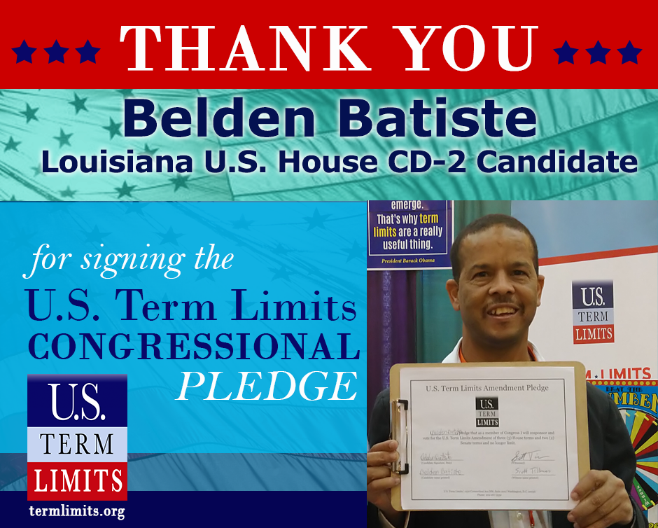 Washington, D.C. – U.S. Term Limits (USTL), the leader in the national movement to limit terms for elected officials, today praised Belden Batiste of Louisiana’s Congressional District 2, for signing the term limits pledge. Batiste is the first candidate in this race to commit support to proposing term limits on Congress.