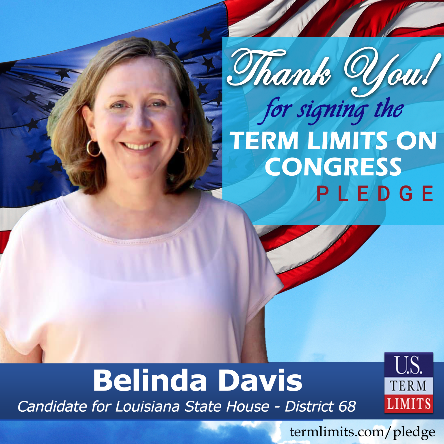 Baton Rouge, LA – U.S. Term Limits (USTL), the leader in the national, non-partisan movement to limit terms for elected officials, is gathering support from state lawmakers across the nation. Its mission is to get 34 states to apply for an amendment proposal convention specific to term limits on Congress. Louisiana state house candidate, Belinda Davis (District 68), has committed support for term limits on Congress by signing the Term Limits Convention pledge. Previously, candidate Dixon McMakin also signed the pledge.