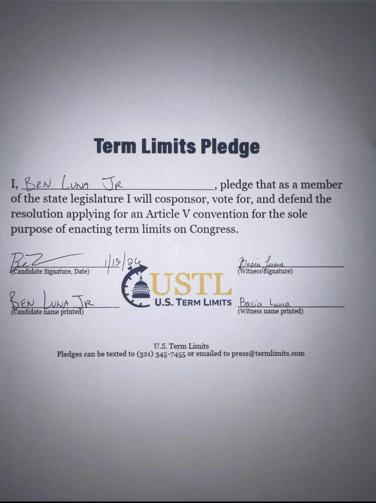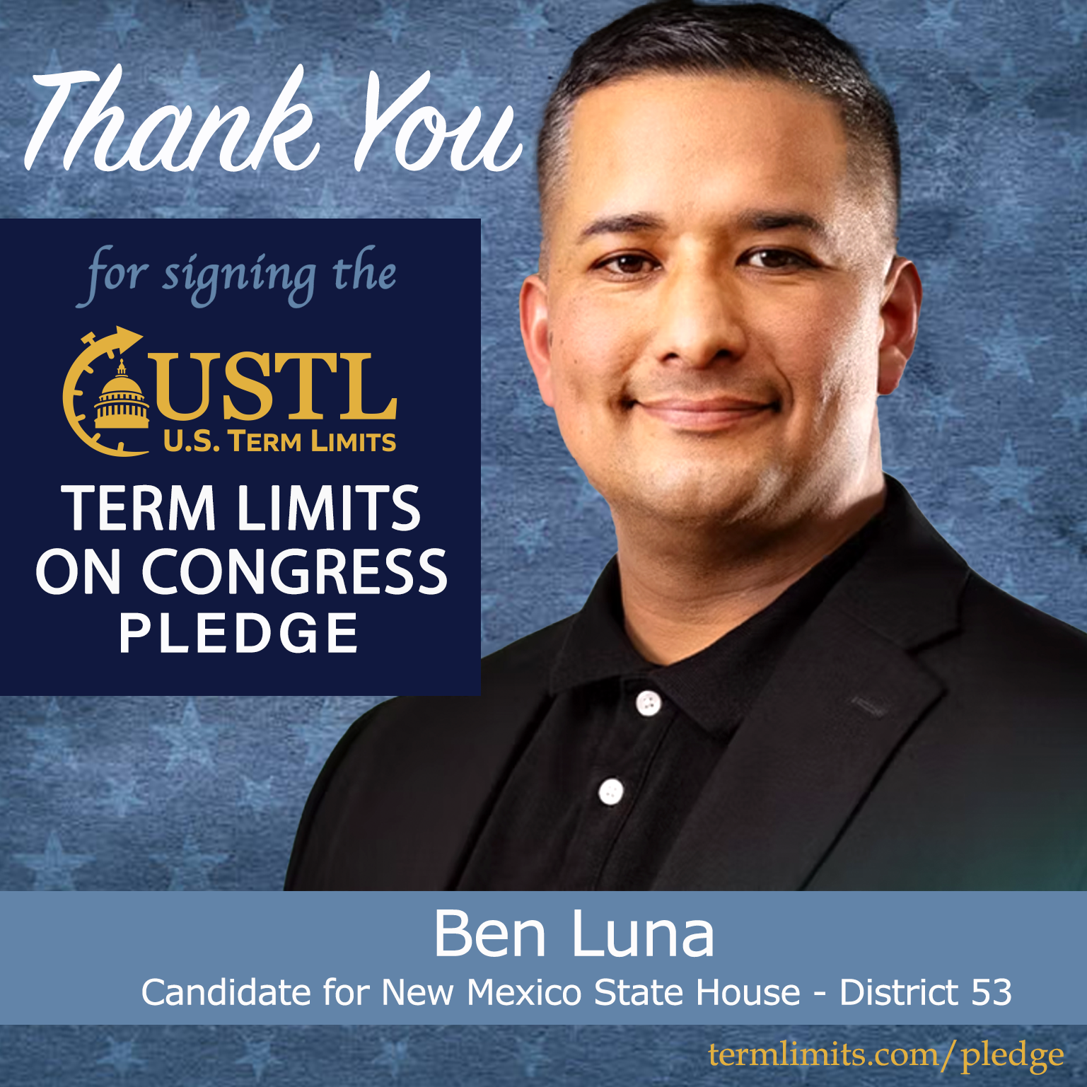 La Cruces, NM – U.S. Term Limits (USTL), the leader in the national, non-partisan movement to limit terms for elected officials, is gathering support from state lawmakers across the nation. Its mission is to get 34 states to apply for an amendment proposal convention specific to term limits on Congress. New Mexico state house candidate, Ben Luna (district 53), has committed support for term limits on Congress by signing the term limits convention pledge.