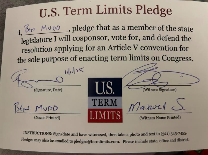 The U.S. Term Limits pledge is provided to candidates and members of state legislatures. It reads, “I pledge that, as a member of the state legislature, I will cosponsor, vote for, and defend the resolution applying for an Article V convention for the sole purpose of enacting term limits on Congress.”