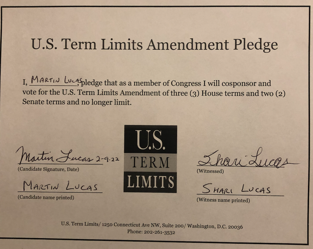 The U.S. Term Limits amendment pledge is provided to every announced candidate for federal office. It reads, “I pledge that as a member of Congress, I will cosponsor and vote for the U.S. Term Limits amendment of three (3) House terms and two (2) Senate terms and no longer limit.” The U.S. Term Limits constitutional amendment has been introduced in both the U.S. Senate by Senator Ted Cruz and his colleagues (SJR3) and the U.S. House by Representative Ralph Norman (HJR12).