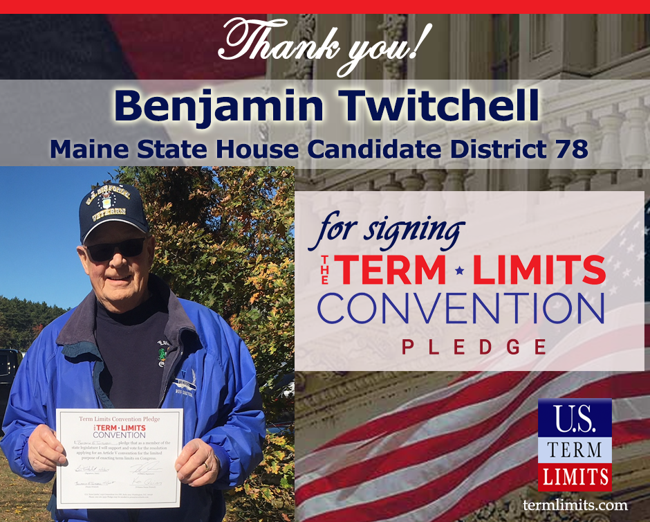 Washington, D.C. – U.S. Term Limits (USTL), the leader in the national, non-partisan movement to limit terms for elected officials, is gathering support from state lawmakers across the nation. Its mission is to get 34 states to apply for an amendment proposal convention specific to term limits on Congress. Maine house candidate Ben Twitchell (district 78), is the first candidate in this race to support term limits on Congress by signing the Term Limits Convention pledge.