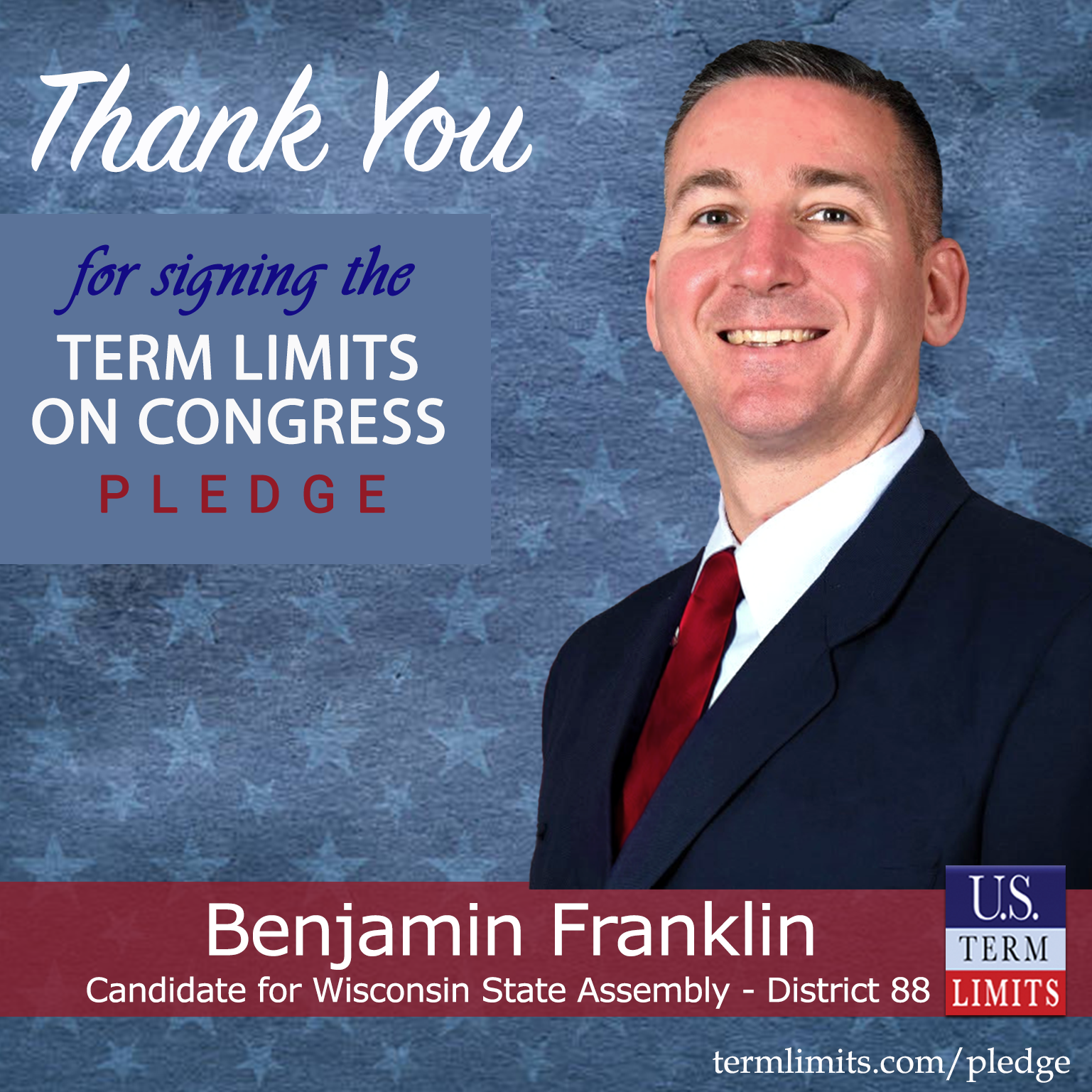 De Pere, WI – U.S. Term Limits (USTL), the leader in the national, non-partisan movement to limit terms for elected officials, is gathering support from state lawmakers across the nation. Its mission is to get 34 states to apply for an amendment proposal convention specific to term limits on Congress. Wisconsin state assembly candidate, Benjamin Franklin (district 88), has committed support for term limits on Congress by signing the term limits convention pledge.