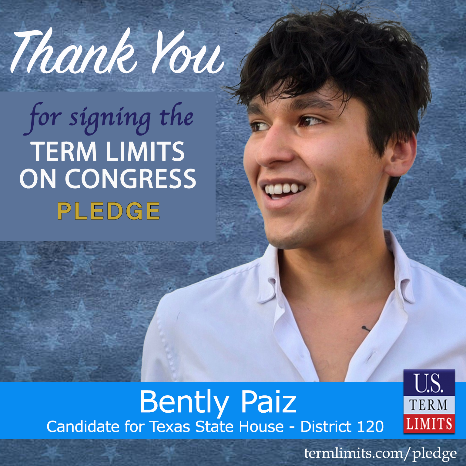 Kirby, TX – U.S. Term Limits (USTL), the leader in the national, non-partisan movement to limit terms for elected officials, is gathering support from state lawmakers across the nation. Its mission is to get 34 states to apply for an amendment proposal convention specific to term limits on Congress. 2026 Texas state house candidate, Bently Paiz (district 120), has committed support for term limits on Congress by signing the term limits convention pledge.