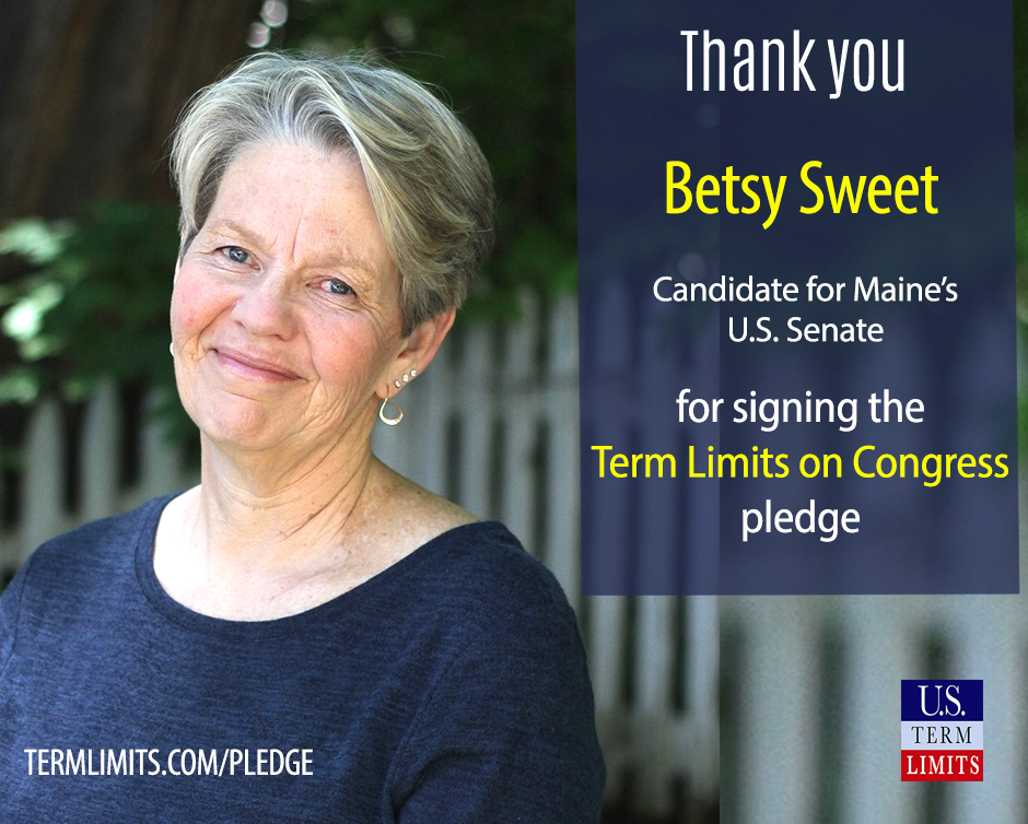 Washington, D.C. – U.S. Term Limits (USTL), the leader in the non-partisan national movement to limit terms for elected officials, praises Betsy Sweet, 2020 U.S. Senate candidate from Maine, for signing the pledge for an amendment to term limit Congress. Previously, candidate Bre Kidman also signed the pledge. Sweet and Kidman are challenging Senator Susan Collins, who, although she signed the U.S. Term Limits pledge back in 1996, has not acted to support congressional term limits as promised. According to our records, she last cosponsored our term limits resolution in 1997, twenty-two years ago.