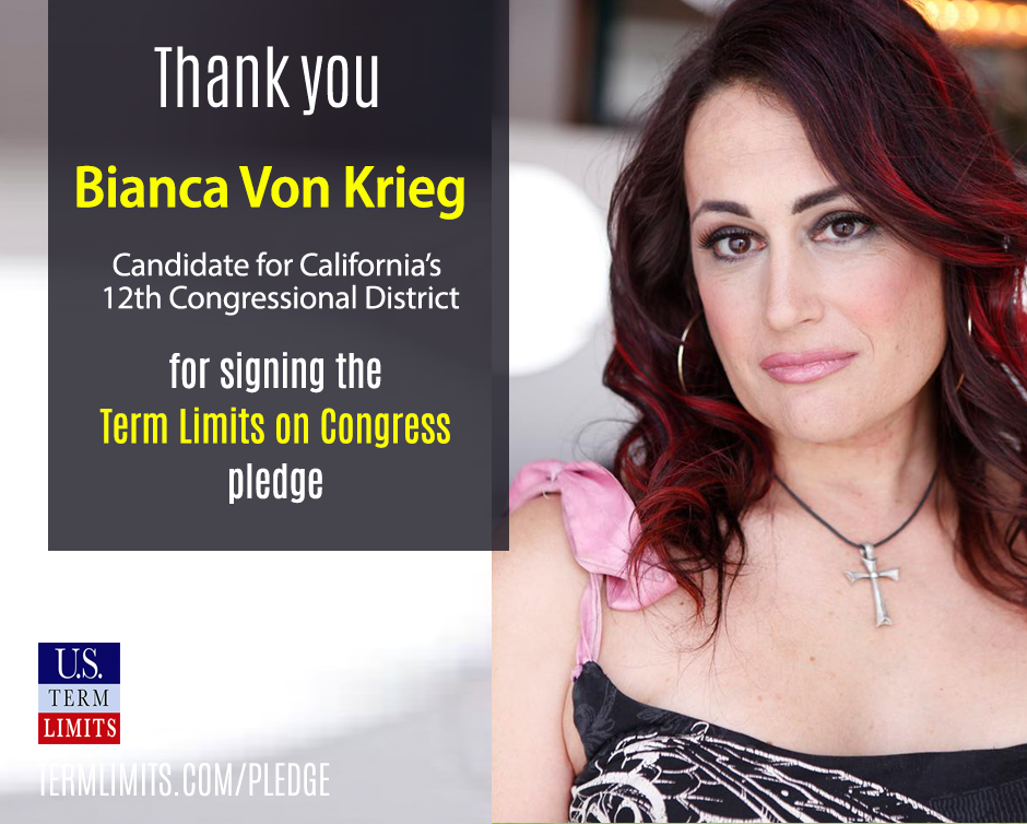 Washington D.C. – U.S. Term Limits (USTL), the leader in the non-partisan national movement to limit terms for elected officials, praises 2022 U.S. house candidate for California, Bianca Von Krieg (district 12), for signing the pledge for an amendment to term limit Congress. Von Krieg is the first signer in this race.