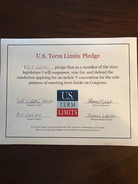 Terre Haute, IN – U.S. Term Limits (USTL), the leader in the national, non-partisan movement to limit terms for elected officials, is gathering support from state lawmakers across the nation. Its mission is to get 34 states to apply for an amendment proposal convention specific to term limits on Congress. Indiana state senate candidate, Bill Webster (district 23) has committed support for term limits on Congress by signing the Term Limits Convention pledge. Previously, candidates Spencer Deery, Paula Copenhaver and Christian Beaver also signed the pledge.