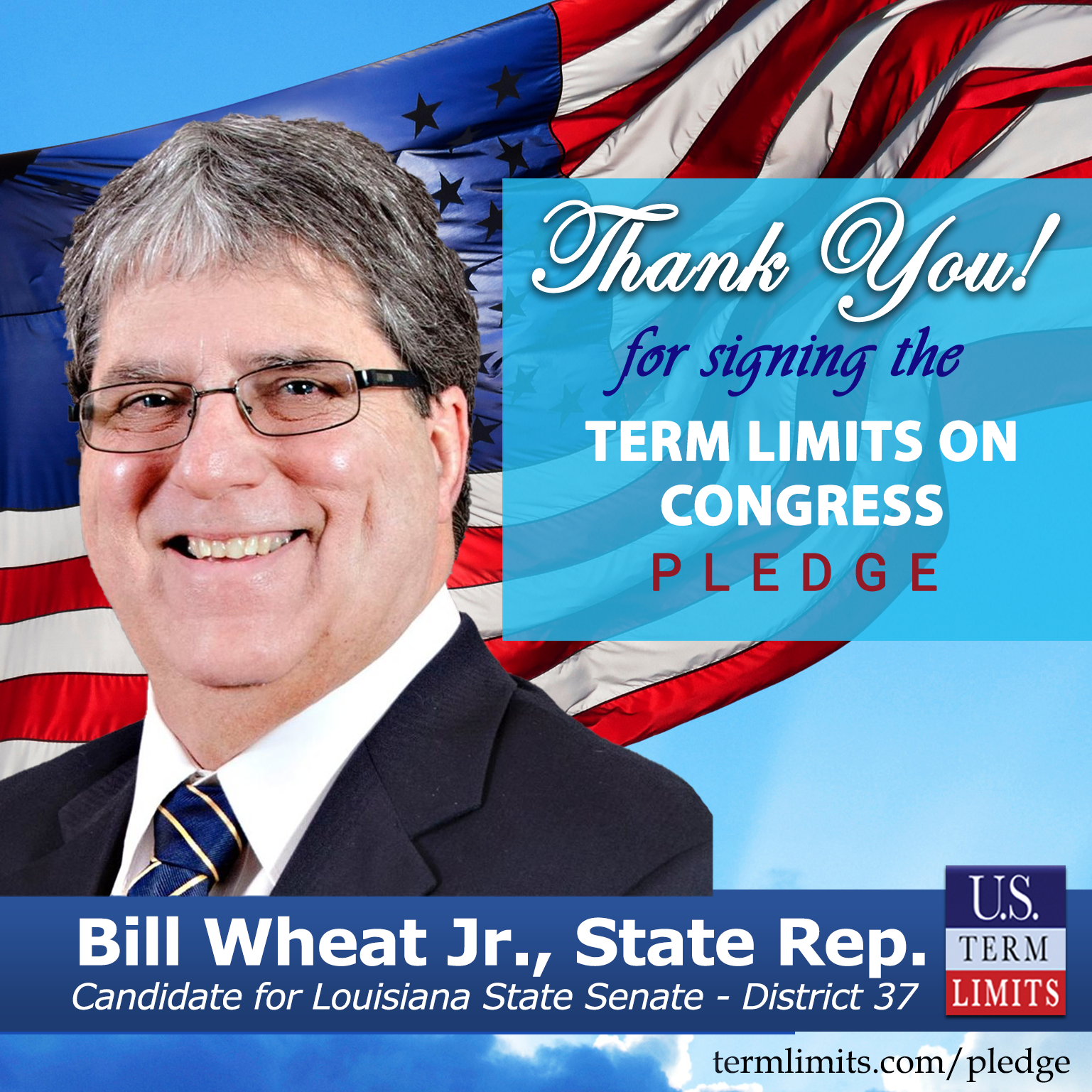 Hammond, LA – U.S. Term Limits (USTL), the leader in the national, non-partisan movement to limit terms for elected officials, is gathering support from state lawmakers across the nation. Its mission is to get 34 states to apply for an amendment proposal convention specific to term limits on Congress. Louisiana state senate candidate, Rep. Bill Wheat Jr. (District 37), has committed support for term limits on Congress by signing the Term Limits Convention pledge. Previously, candidate Randy Bush also signed the pledge.