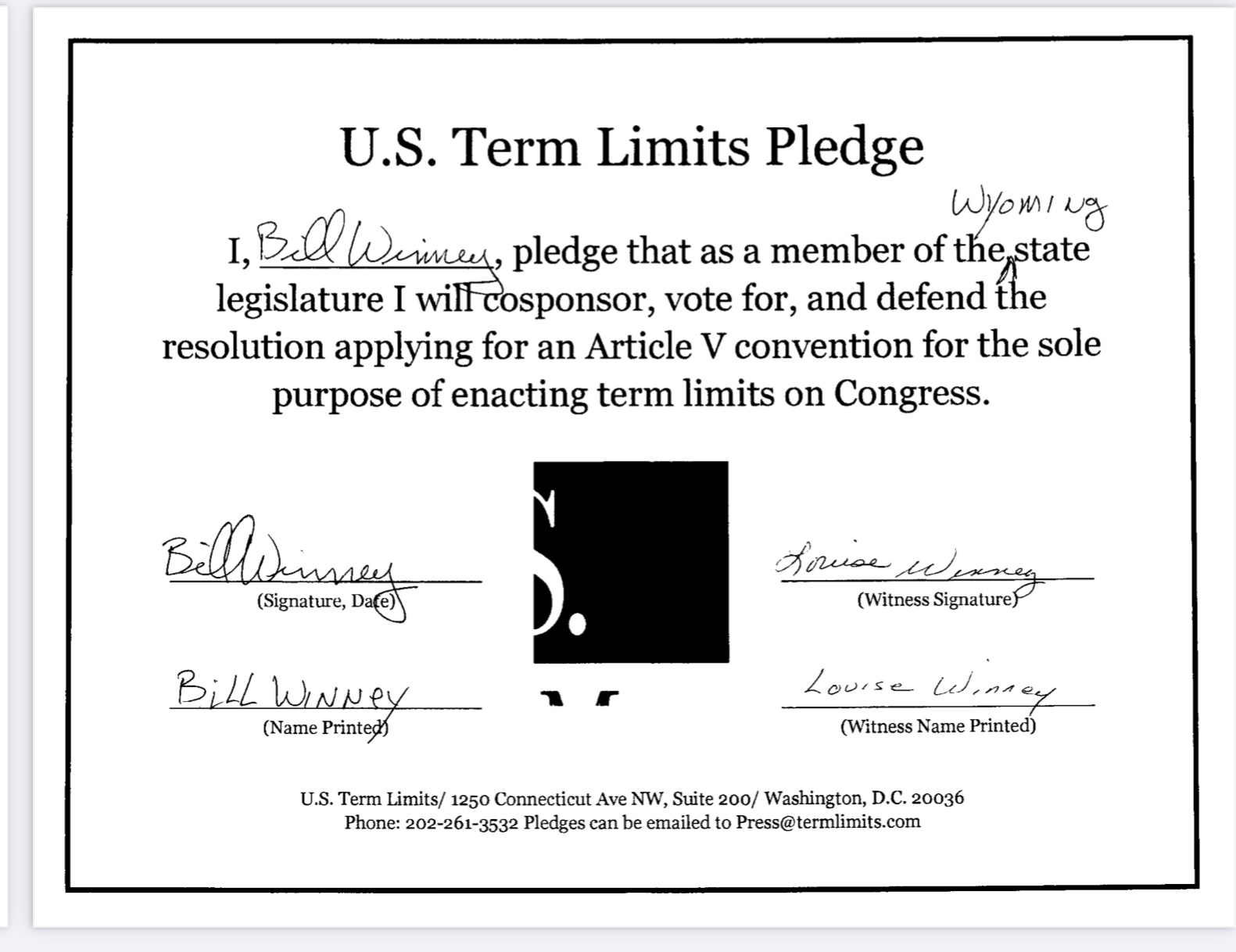 USTL President, Philip Blumel, commented on Winney’s pledge saying, “Bill’s support of term limits shows that there are individuals who are willing to listen to the majority of voters who want term limits. America needs a Congress that will be served by citizen legislators, not career politicians.”