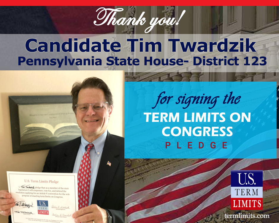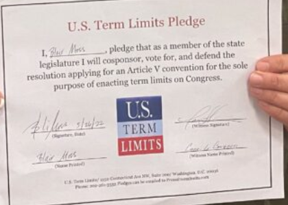 The U.S. Term Limits pledge is provided to candidates and members of state legislatures. It reads, “I pledge that, as a member of the state legislature, I will cosponsor, vote for, and defend the resolution applying for an Article V convention for the limited purpose of enacting term limits on Congress.”