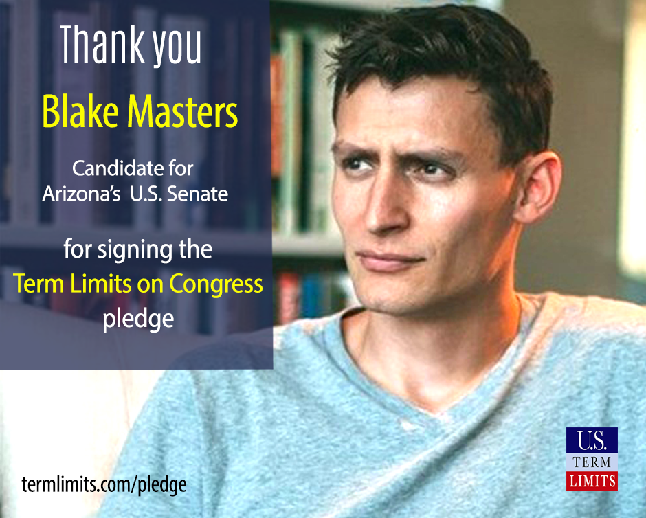 Washington D.C. – U.S. Term Limits (USTL), the leader in the non-partisan national movement to limit terms for elected officials, praises 2022 U.S. senate candidate for Arizona, Blake Masters, for signing the pledge for an amendment to term limit Congress. Previously, candidates Jim Lamon and Rob Paveza also signed the pledge.