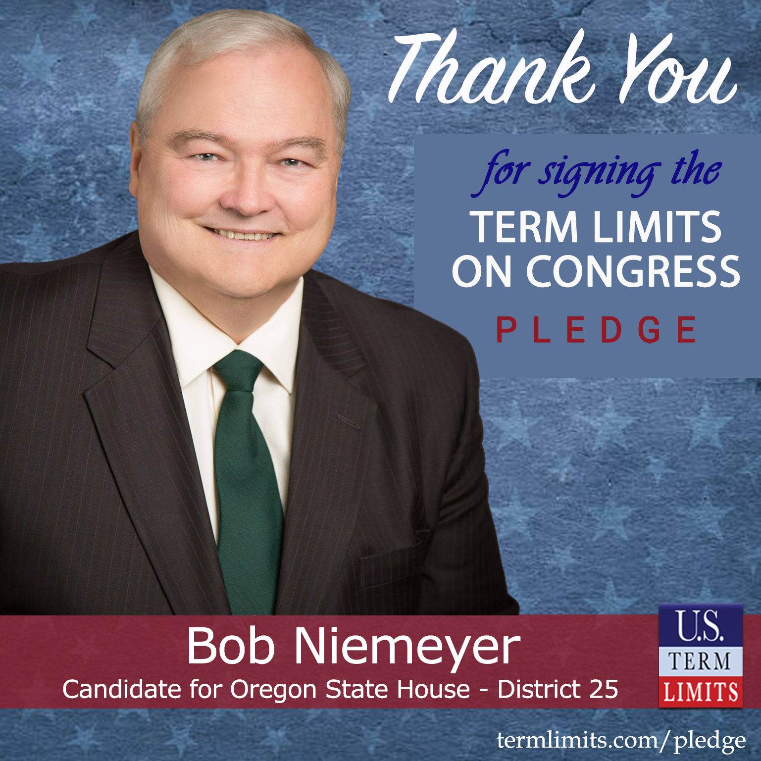 Salem, OR – U.S. Term Limits (USTL), the leader in the national, non-partisan movement to limit terms for elected officials, is gathering support from state lawmakers across the nation. Its mission is to get 34 states to apply for an amendment proposal convention specific to term limits on Congress. Oregon state house candidate, Bob Niemeyer (district 25), has committed support for term limits on Congress by signing the term limits convention pledge.