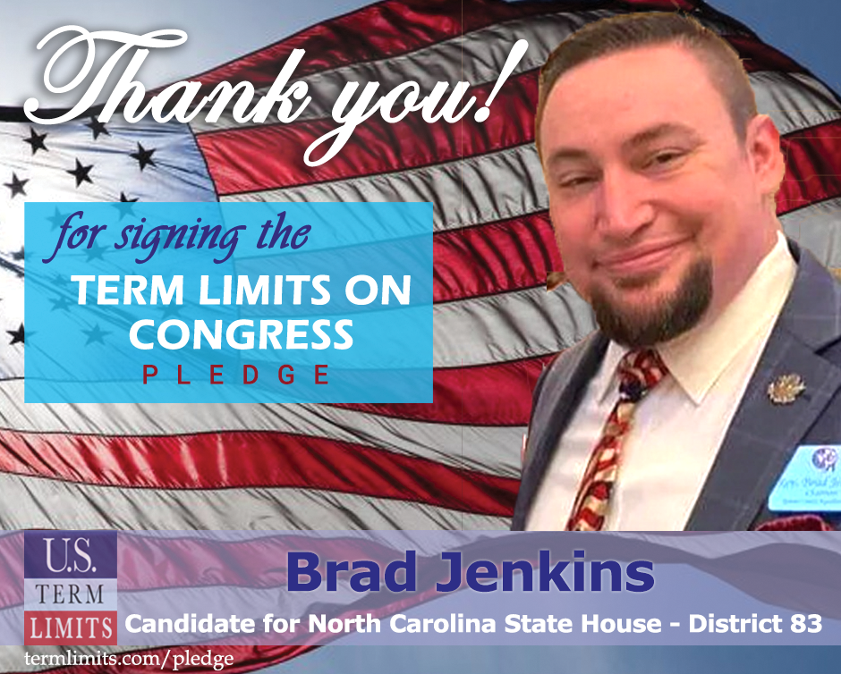 Charlotte, NC – U.S. Term Limits (USTL), the leader in the national, non-partisan movement to limit terms for elected officials, is gathering support from state lawmakers across the nation. Its mission is to get 34 states to apply for an amendment proposal convention specific to term limits on Congress. North Carolina state house candidate, Brad Jenkins (district 83) has committed support for term limits on Congress by signing the Term Limits Convention pledge. Jenkins is the first signer in this race.