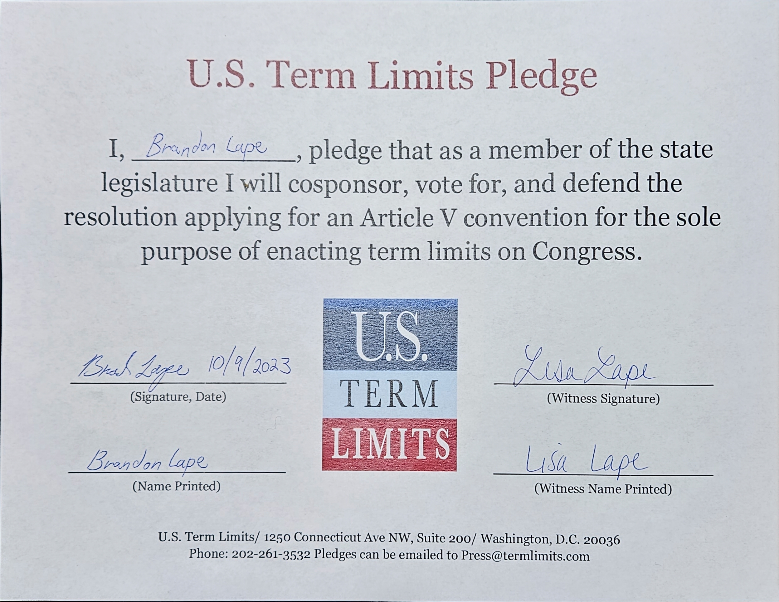 USTL President, Philip Blumel, commented on Lape’s pledge saying, “Brandon’s strong support of term limits shows that there are individuals who are willing to listen to the majority of voters who want term limits. America needs a Congress that will be served by citizen legislators, not career politicians.”