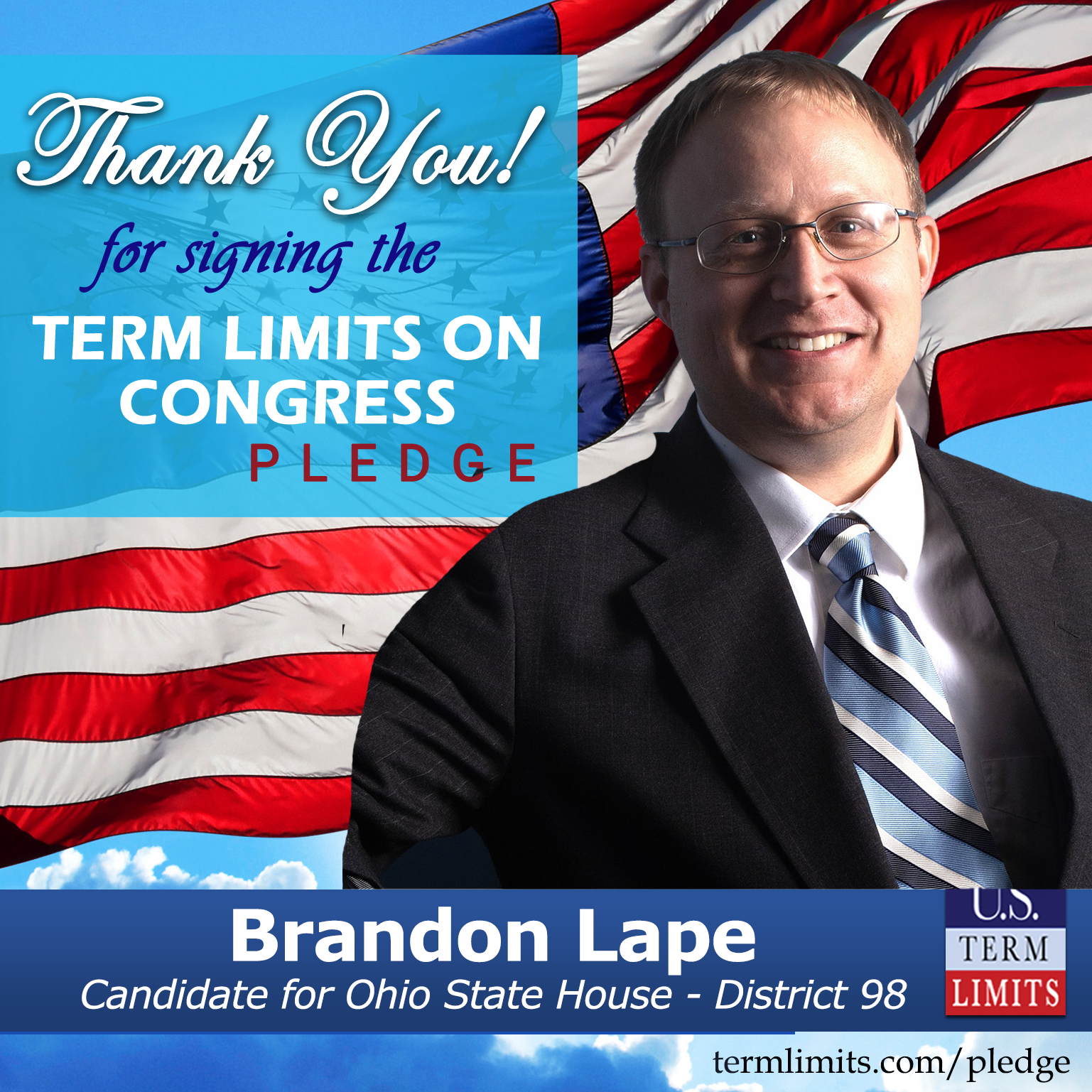 Columbus, OH – U.S. Term Limits (USTL), the leader in the national, non-partisan movement to limit terms for elected officials, is gathering support from state lawmakers across the nation. Its mission is to get 34 states to apply for an amendment proposal convention specific to term limits on Congress. Ohio state house candidate, Brandon Lape (District 98), has committed support for term limits on Congress by signing the term limits convention pledge. Lape is the first signer in this race.