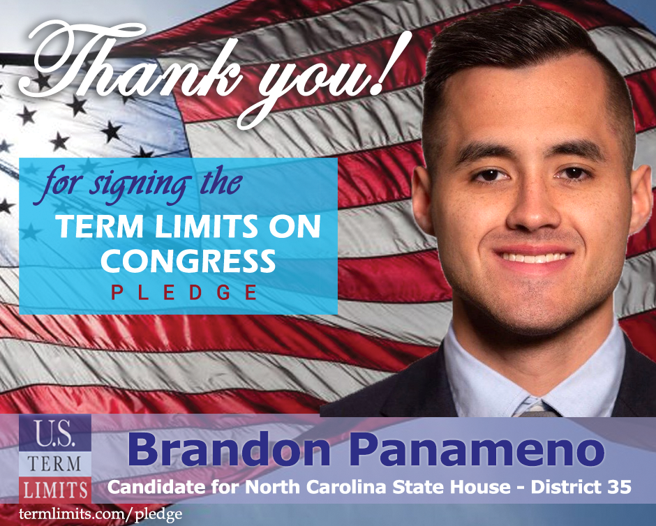 Raleigh, NC – U.S. Term Limits (USTL), the leader in the national, non-partisan movement to limit terms for elected officials, is gathering support from state lawmakers across the nation. Its mission is to get 34 states to apply for an amendment proposal convention specific to term limits on Congress. North Carolina state house candidate, Brandon Panameno (district 35) has committed support for term limits on Congress by signing the Term Limits Convention pledge. Panameno is the first signer in this race.