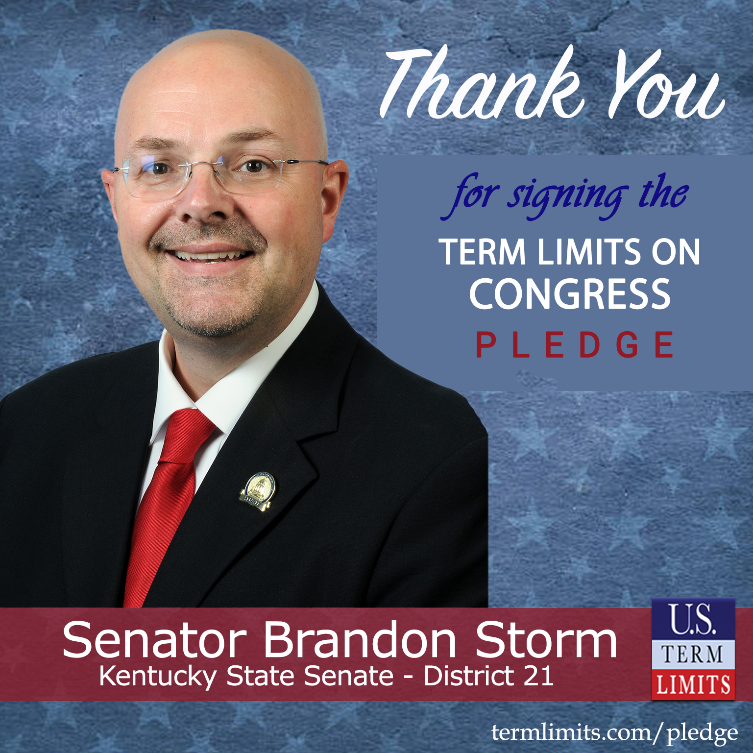 Frankfort, KY – U.S. Term Limits (USTL), the leader in the national, non-partisan movement to limit terms for elected officials, is gathering support from state lawmakers across the nation. Its mission is to get 34 states to apply for an amendment proposal convention specific to term limits on Congress. Kentucky state Senator Brandon Storm (District 21), has committed support for term limits on Congress by signing the term limits convention pledge.