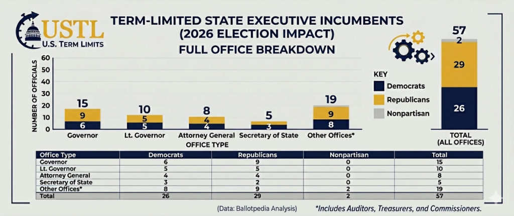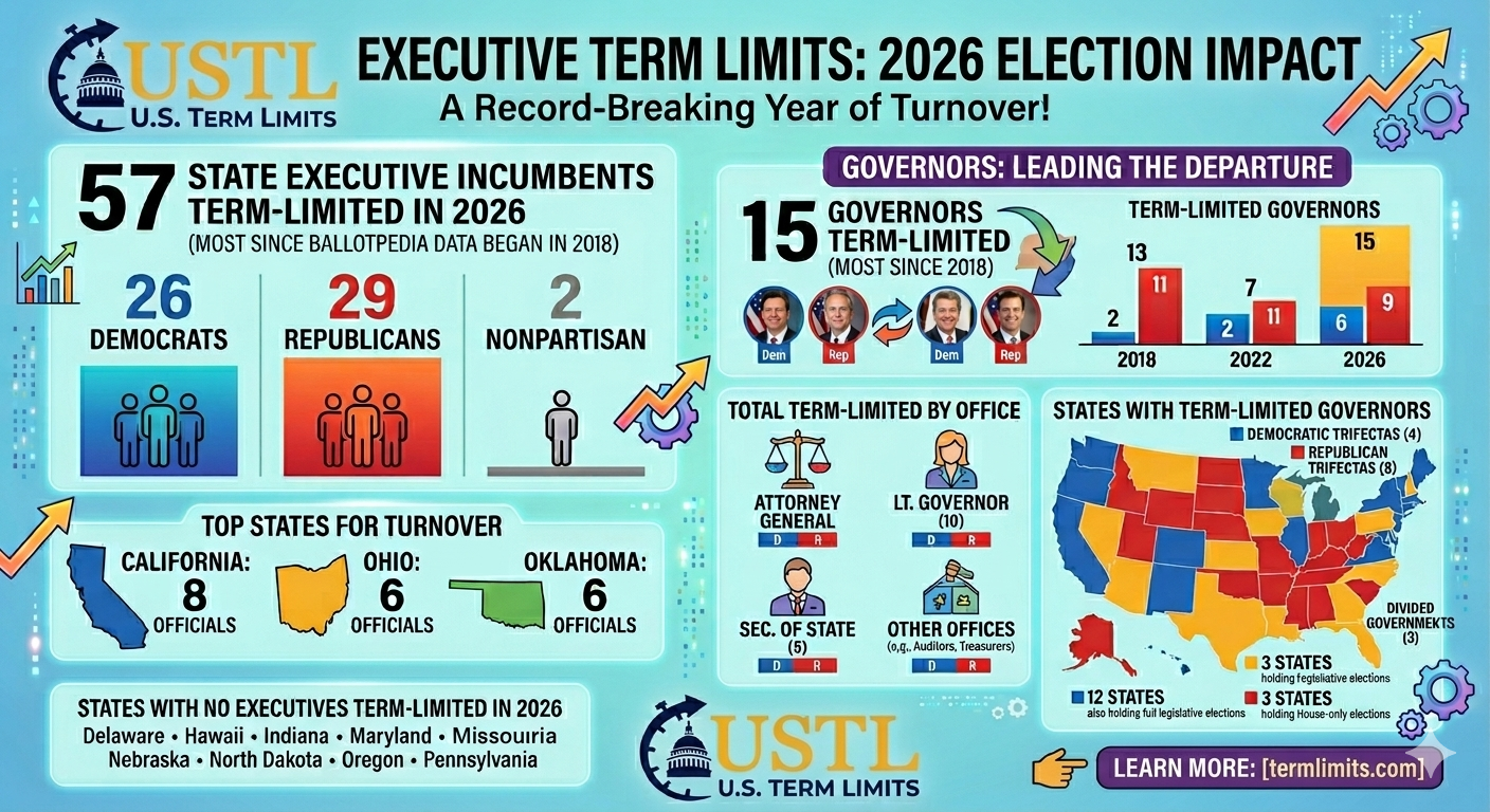 According to new data from Ballotpedia, a record-breaking 57 state executive incumbents are ineligible to run for re-election in 2026 due to term limits. This includes 26 Democrats, 29 Republicans, and two nonpartisan officeholders. This is the highest number of term-limited state executives recorded since data collection began in 2018.