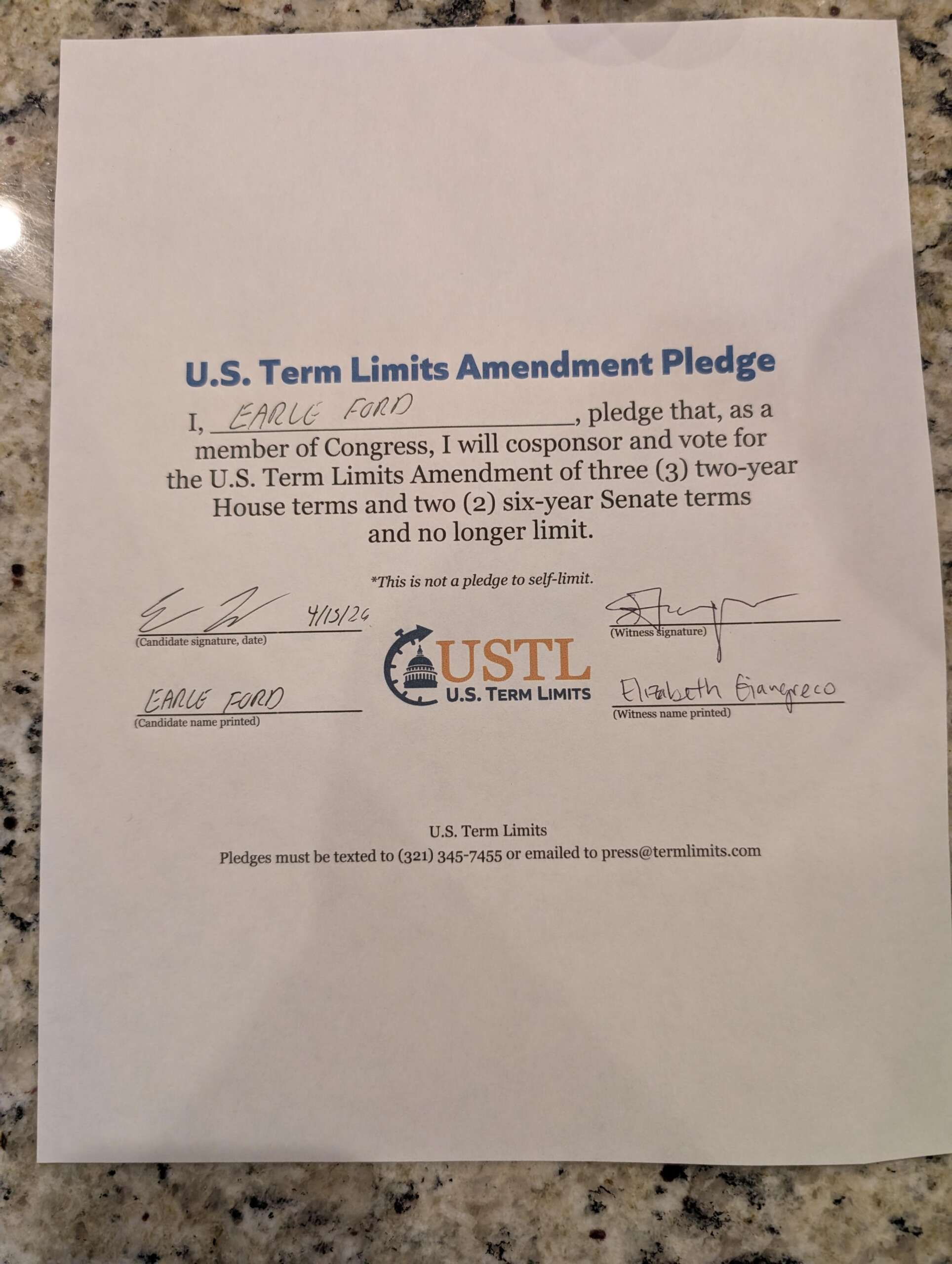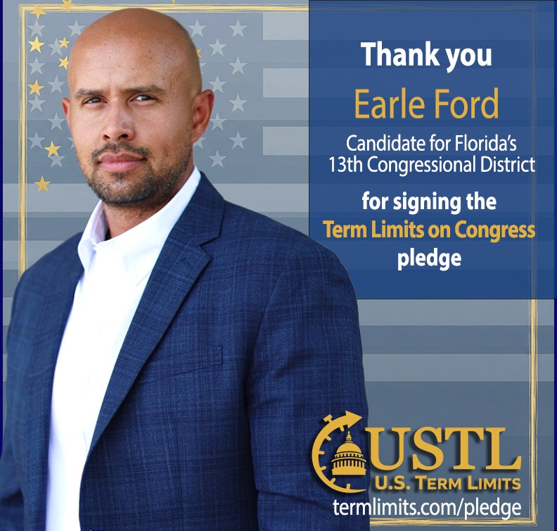 Washington D.C. – U.S. Term Limits (USTL), the leader in the non-partisan national movement to limit terms for elected officials, praises 2026 U.S. Representative candidate for Florida, Earle Ford (district 13), for signing the pledge for an amendment to term limit Congress. Previously, candidate Jeff Moore also signed. Incumbent Rep. Anna Paulina Luna also signed but then broke her pledge.
