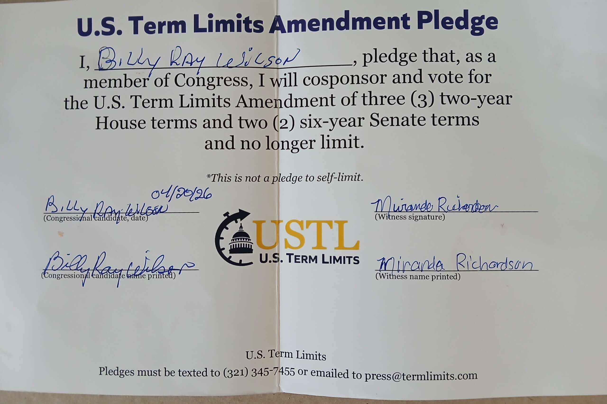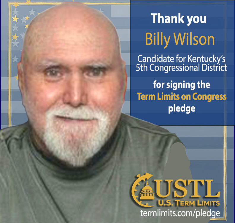 Washington D.C. – U.S. Term Limits (USTL), the leader in the non-partisan national movement to limit terms for elected officials, praises 2026 U.S. Representative candidate for Kentucky, Billy Wilson (district 5), for signing the pledge for an amendment to term limit Congress. Previously, candidates Ned Pillersdorf, Benjamin Hurley and Kevin Smith also signed.