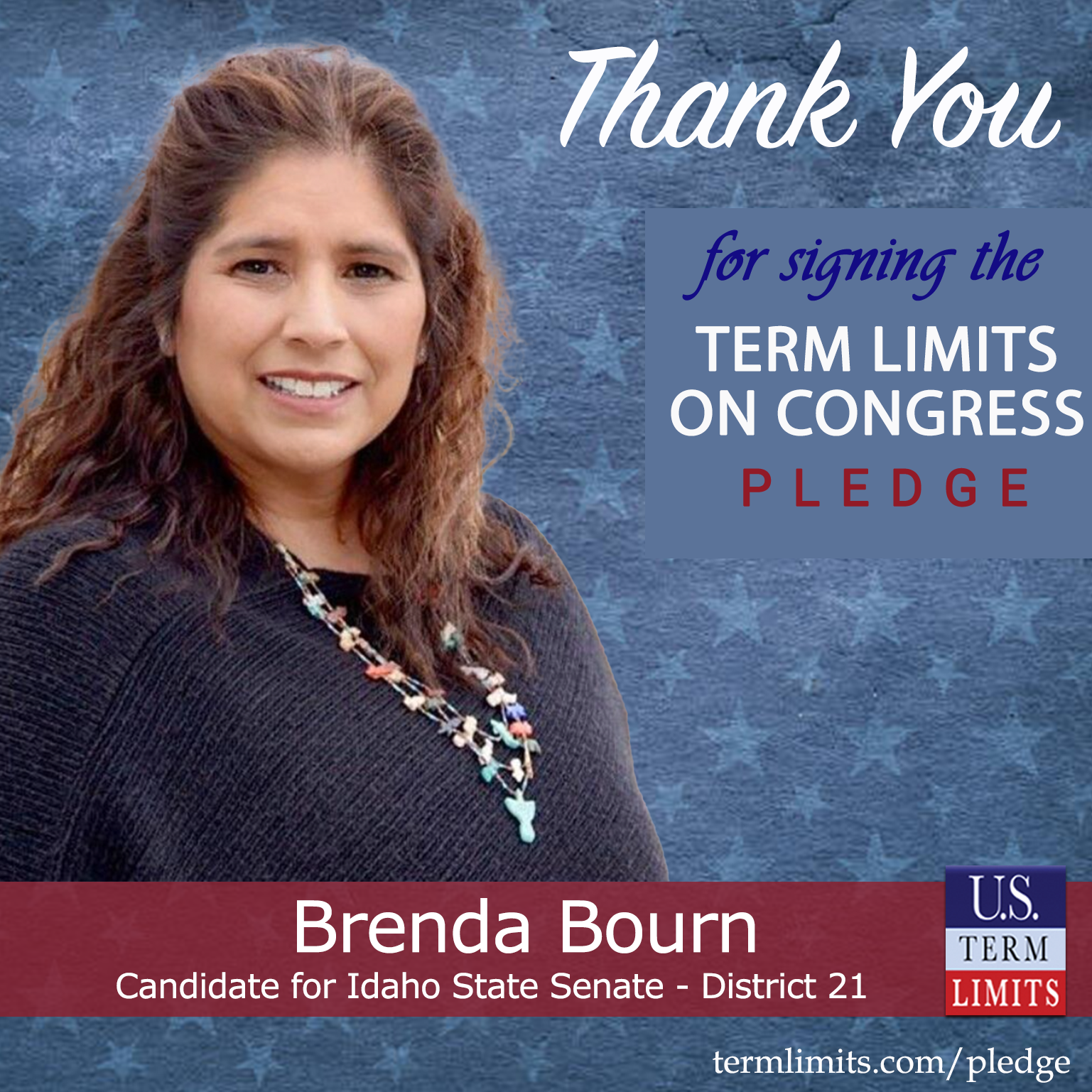Boise, ID – U.S. Term Limits (USTL), the leader in the national, non-partisan movement to limit terms for elected officials, is gathering support from state lawmakers across the nation. Its mission is to get 34 states to apply for an amendment proposal convention specific to term limits on Congress. Idaho state senate candidate, Brenda Bourn (District 21), has committed support for term limits on Congress by signing the Term Limits Convention Pledge. Bourn is the first signer in this race.