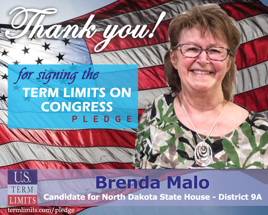 Belcourt, ND – U.S. Term Limits (USTL), the leader in the national, non-partisan movement to limit terms for elected officials, is gathering support from state lawmakers across the nation. Its mission is to get 34 states to apply for an amendment proposal convention specific to term limits on Congress. North Dakota state house candidate, Brenda Malo (district 9A) has committed support for term limits on Congress by signing the Term Limits Convention pledge.