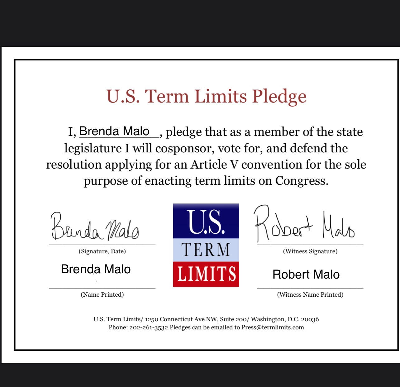 USTL President, Philip Blumel, commented on Malo’s pledge saying, “Brenda’s support of term limits shows that there are individuals who are willing to listen to the majority of voters who want term limits. America needs a Congress that will be served by citizen legislators, not career politicians.”
