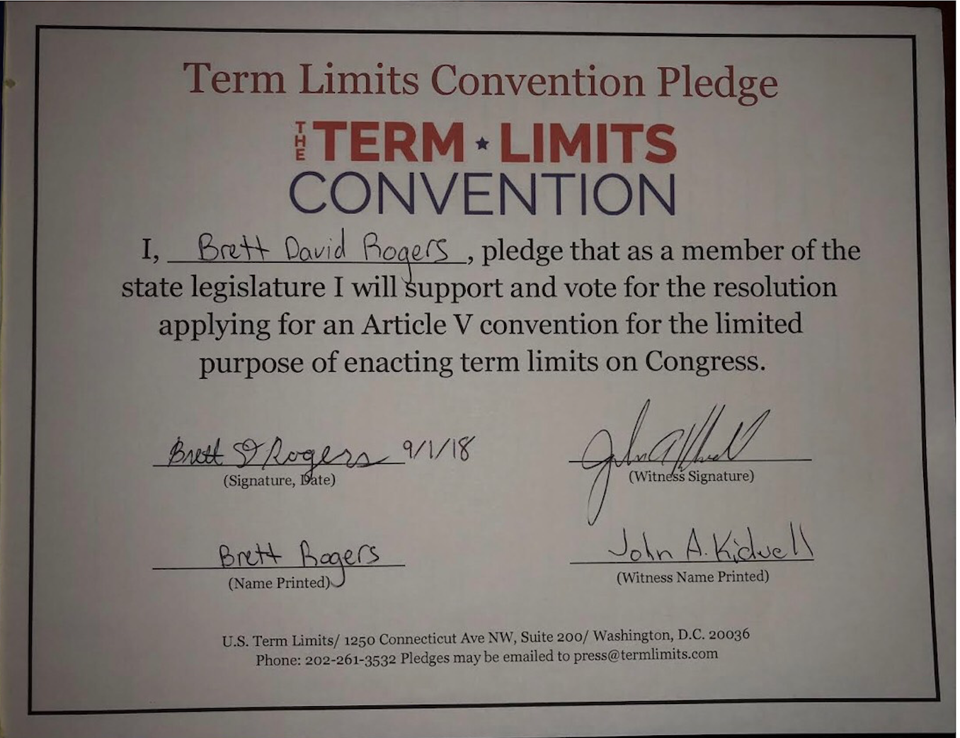 U.S. Term Limits Praises Brett Rogers for Signing Pledge