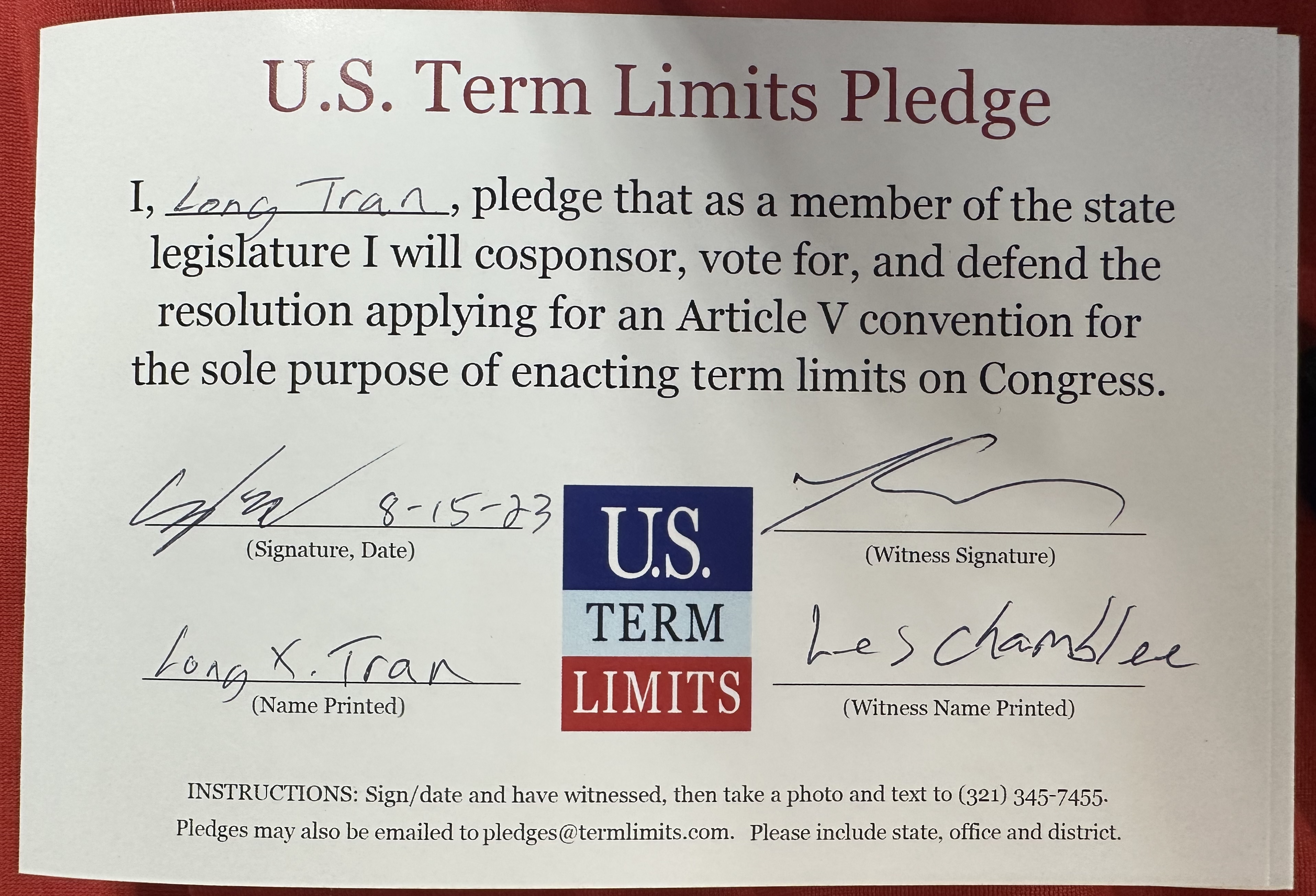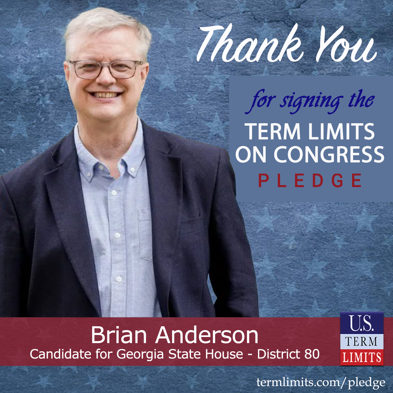 Dunwoody, GA – U.S. Term Limits (USTL), the leader in the national, non-partisan movement to limit terms for elected officials, is gathering support from state lawmakers across the nation. Its mission is to get 34 states to apply for an amendment proposal convention specific to term limits on Congress. Georgia state house candidate, Brian Anderson (district 80), has committed support for term limits on Congress by signing the term limits convention pledge. Previously, incumbent Rep. Long Tran also signed the pledge.