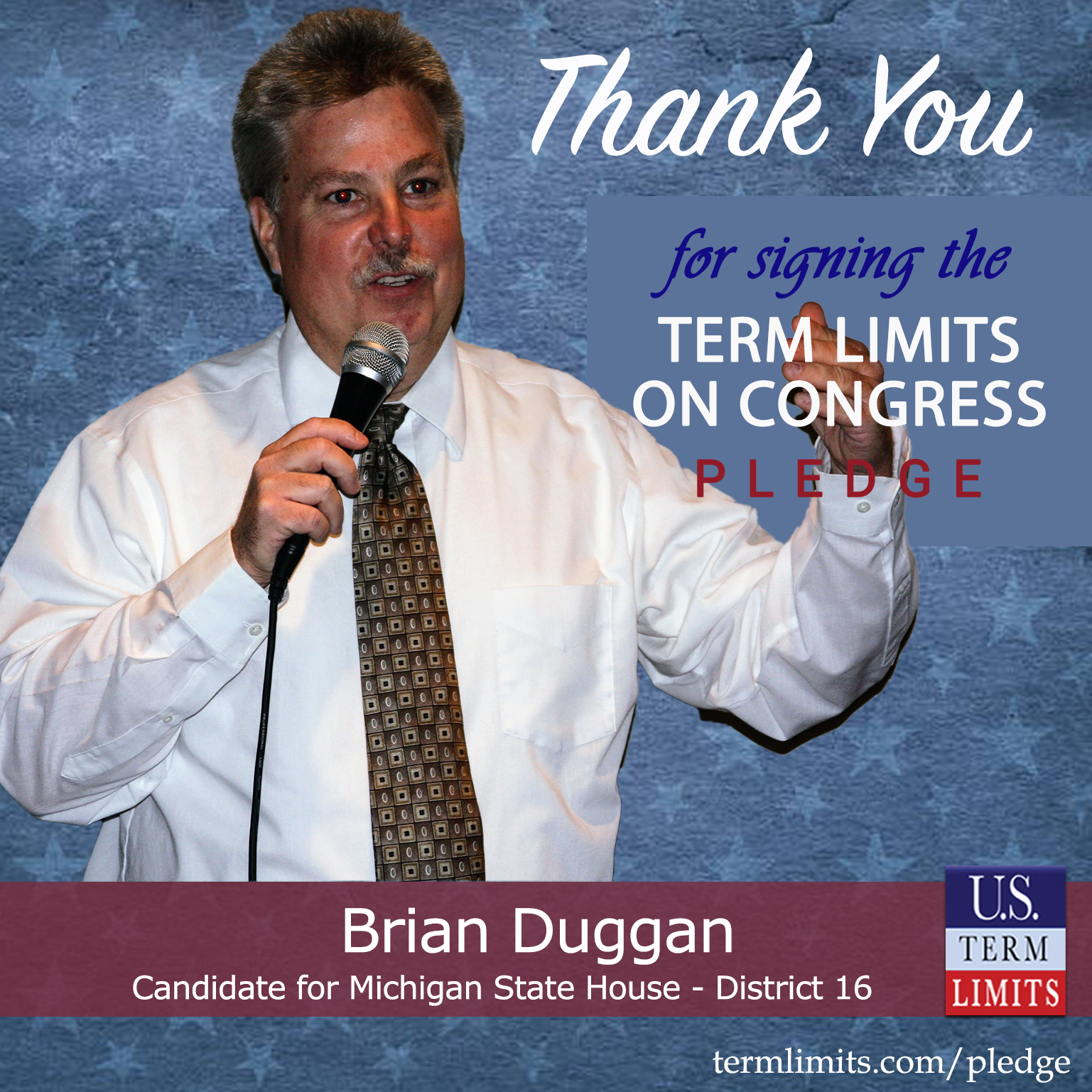 Lansing, MI – U.S. Term Limits (USTL), the leader in the national, non-partisan movement to limit terms for elected officials, is gathering support from state lawmakers across the nation. Its mission is to get 34 states to apply for an amendment proposal convention specific to term limits on Congress. Michigan state house candidate, Brian Duggan (District 16), has committed support for term limits on Congress by signing the Term Limits Convention Pledge.