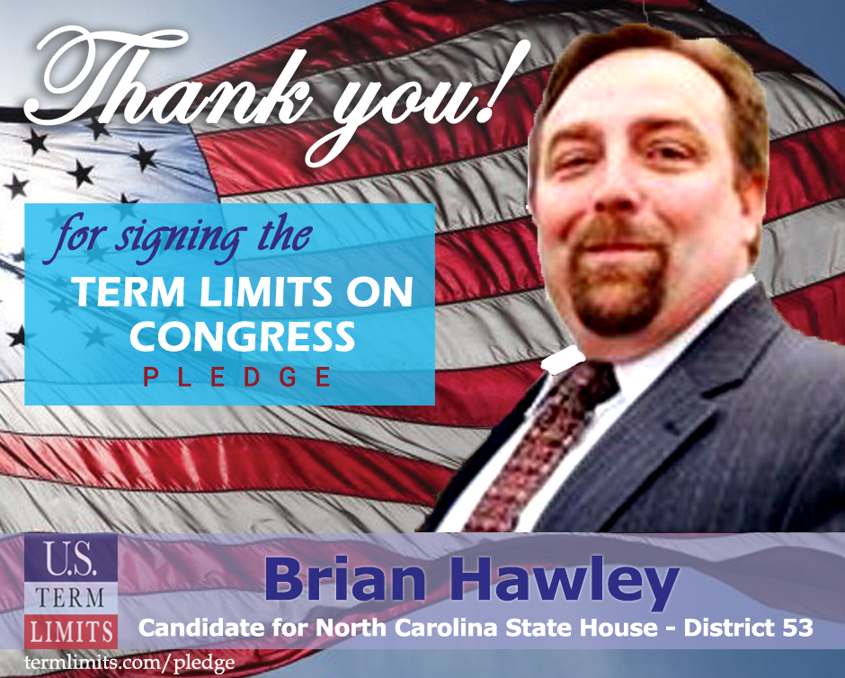 Dunn, NC – U.S. Term Limits (USTL), the leader in the national, non-partisan movement to limit terms for elected officials, is gathering support from state lawmakers across the nation. Its mission is to get 34 states to apply for an amendment proposal convention specific to term limits on Congress. North Carolina state house candidate, Brian Hawley (district 53) has committed support for term limits on Congress by signing the Term Limits Convention pledge. Hawley is the first signer in this race.