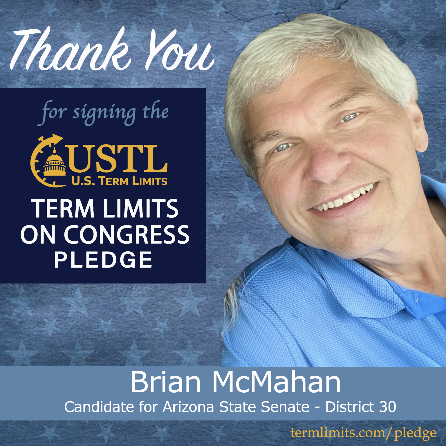 Bullhead City, AZ – U.S. Term Limits (USTL), the leader in the national, non-partisan movement to limit terms for elected officials, is gathering support from state lawmakers across the nation. Its mission is to get 34 states to apply for an amendment proposal convention specific to term limits on Congress. Arizona state senate candidate, Brian McMahan (district 30), has committed support for term limits on Congress by signing the term limits convention pledge. Previously, incumbent Rep. Leo Biasiucci signed and then broke his pledge.